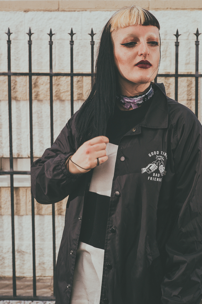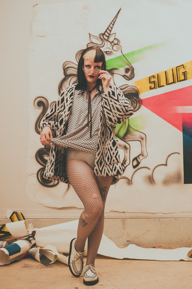 Xena Jade is a staple member of SLUG‘s Marketing Team, and you’ve likely noticed their bold look at local events around town. Jade uses makeup and clothing as a continual living art project that blurs the lines between aesthetic style and self-expression on a daily basis.