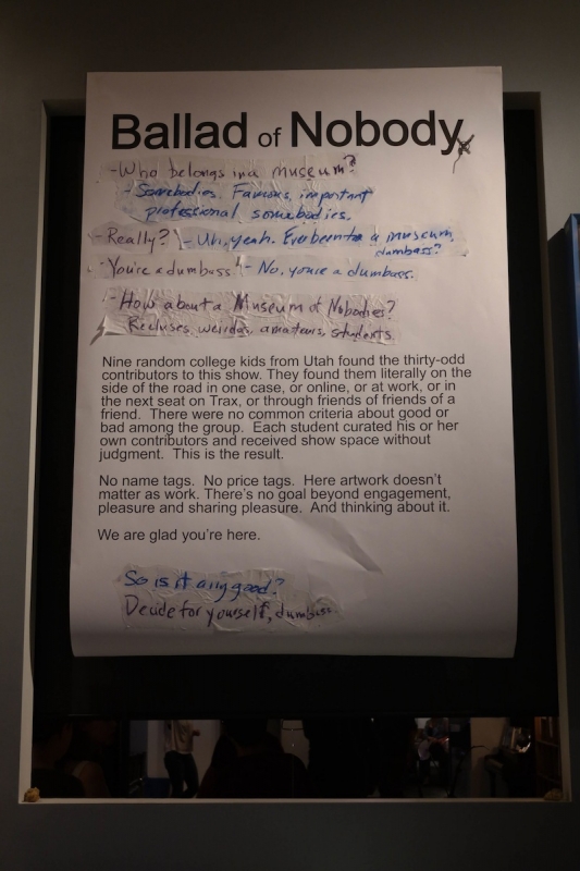 Founded on the idea of celebrating art regardless of meaning, The Museum of Nobody openly invites and encourages the exploration of creativity. Nine students from the University of Utah curated the show. Thirty or so contributors, discovered from a variety of avenues that lacked any system or regulation, were provided an opportunity to showcase their talents under a veil of namelessness.