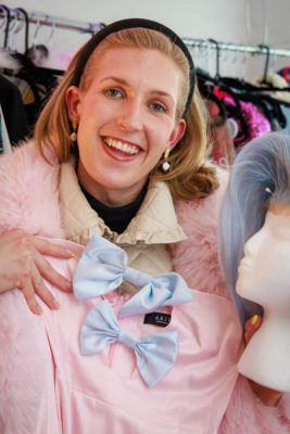 Trans Glory Fit: With the news media of Utah covering more anti-trans bills through the legislative session, this Ann-Margret–inspired garment aims to take a stand. The light-pink dress—matched with baby blue bows, reflecting the colors of the transgender flag—is a one-in-many design, promoting advocacy and respect for the trans community. “I wanted to make a goal to show what real trans glory is,” says Meredith. “If any of these people got to know us on a personal level, it could change their minds.”