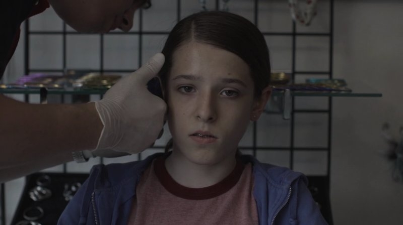 We’re all too familiar with the mom-trope of an overbearing germophobe wrapped up in her own world with paranoia over controlling situations, and we often see that paired with the child that becomes distanced and quiet in response. In an attempt to be a good mom for a day, she promises her daughter to get her ears pierced, and we soon find the two in a hospital, meeting up with a doctor that the mother is obviously familiar with, perhaps from him being her lover, current or past. Before the doctor can complete the procedure, however, the mom interjects with an insistence on the placement of the dots, which escalates into a petty argument that leads the daughter to the bathroom. The daughter’s first step of rebellion comes in going to the bathroom in the men’s room, and ends with a final act of a “Fuck you mom!” when they go to a retail store and she gets her ears pierced while the mom is outside on the phone. With recurring references and close ups of the hands, the final scene leaves us wincing as the needle gets stuck in her ear. We know that if the mom was around she would have flipped, but instead the girl takes it quietly, and after the struggle of pulling the needle out, we can sense a moment of triumph within the girl, despite her expressionless face.