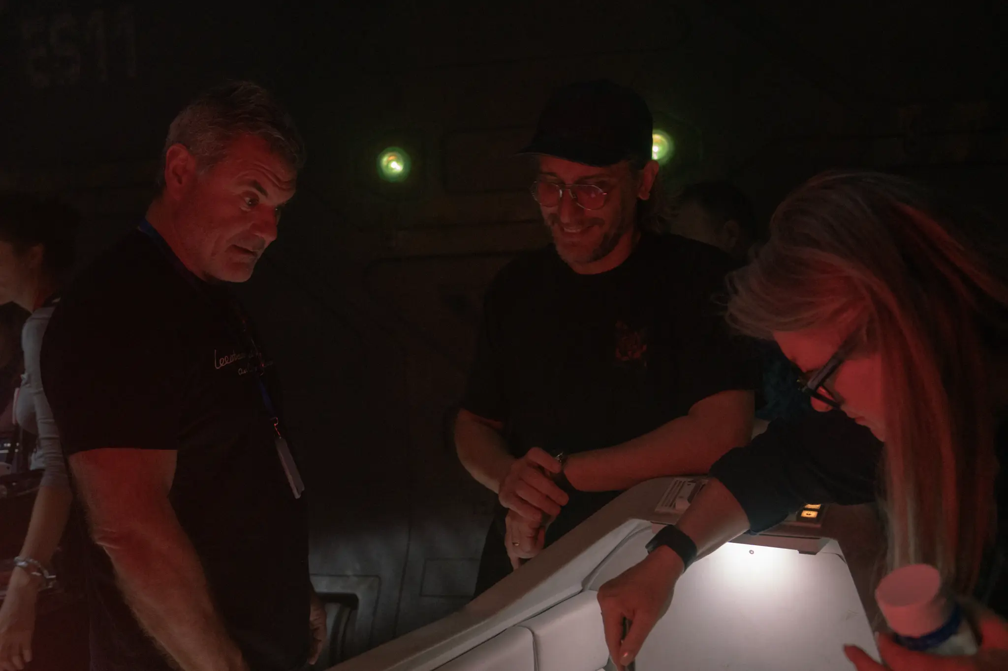 It was on Aliens that Gillis began his longstanding relationship with chestbursters, the infant form of the Xenomorph, which gestates inside a human host and the bursts forth from its chest. In Alien: Romulus, Gillis worked closely with director Fede Álvarez to create a new look and feel for how the chestburster would figure into the film. “Rather than go with an explosive, shocking moment, his logic was, ‘the audience knows it’s coming,’” Gillis says. “So it births itself in a much slower way, and it’s more akin to a human birth.” As a puppeteer, Gillis controlled the tiny creature emerging with the chest of the space craft’s pilot, Navarro, portrayed by actress Aileen Wu. “Our work is only as good as the actors who are interacting with it, who are reacting to it,” Gillis says. “And she was in an uncomfortable situation for the entire day of of actual shooting. And she stayed cheerful. And then she would go right into the agonized portrayal of it.” Gillis credits the emphasis that Álvarez put on utilizing practical effects over computer generated whenever possible an integral part of making Romulus stand out as something special in the modern age of filmmaking. “He would give us directions like, ‘Look up at your mama,’” Gillis says. “And we would make it look up, and it was a really nice opportunity to capitalize on one of the things that practical effects gives you, which is that it’s live, and we, as puppeteers are acting with our on screen talent.” In addition to the creature bursting forth from Navarro’s chest, Gillis worked on what is not only one of the most shocking and memorable effects in Romulus, but the entire Alien series (spoiler warning if you have not yet seen the film.) When a facehugger alien attacks a pregnant crew member, Kay (Isabela Merced), it plants a seed, and instead of following the normal gestation process, it morphs with the child already growing inside her, and Kay gives birth to a Xenomoph egg which then hatches. “We did that as well, which was very grizzly,” Gillis says. In designing the sequences, Gillis and the rest of the team went back to the original concepts of H.R. Geiger, the groundbreaking artist who created the original Xenomorph. “Geiger’s whole thing was like a reproductive nightmare, right?” Gillis says. “And it had to do with sexuality and invasive implanting, and it also had to do with birthing. So we wanted to make sure that at this point in the film, we are really putting our human character through the ringer, because these things can’t be pleasant.”