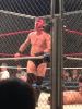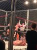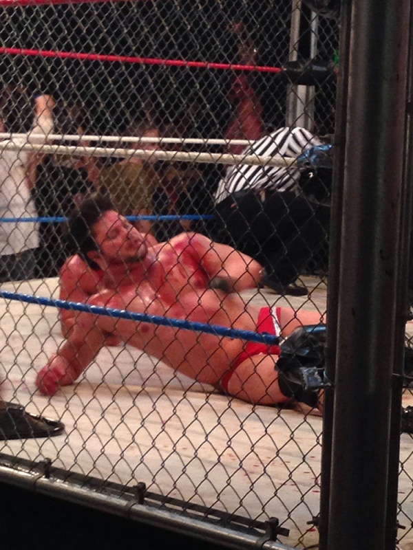 Josh Damien introduced Suede Thompson, even helping him with his baby powder shtick, and you know what? The dude actually managed to get a couple of “suederade!” chants. He’s a sketchy S.O.B., though, and despite his attempts to choke out Lacey Ryan (or pull her pants down!) the athletic superior still won out. The match’s biggest “write home” moment came at the end when, after both comabatants made attempts to climb out of the cage, Ryan swung the unlocked door right into Suede’s face, leaving him down in the ring while she slid out to victory.