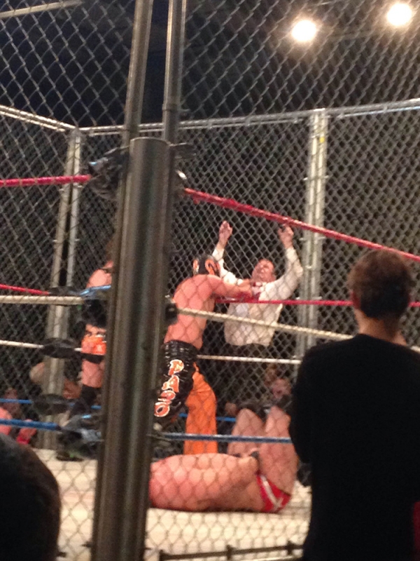 – Los Mochis Paco forcing Slick into the action through the cage wall (see photo above!)