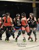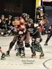 Just before the end of the first period, things started getting intense. With the score of 86 to 42, the Sirens started feeling a little comfortable. Not so for the Daughters. Mili Megahurtz from the Sirens had a quick break through the pack, but Pain in the Nikki was right on her tail. Nikki was so determined to get some more points for the Daughters that she was a blur as she raced around the track. The official ruling allows the jammer (in case of emergency or for strategic reasons) to pass the panties to the pivot. This means that the pivot has now transformed into jammer and can score points. So Mili passed the star helmet cover (informally referred to as the “panties”) to Bloody2Shoes, after which the jam quickly ended. In fact, there were probably more star passes during this game than there were skaters wearing fishnets. In the last jam before halftime, Honey Guns gave her jammer Ace of Aches a nice whip right on the apex of the track, sending her speeding through the rest of the skaters.