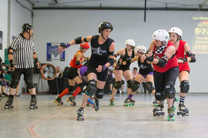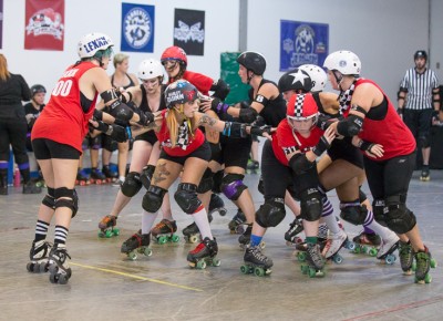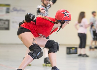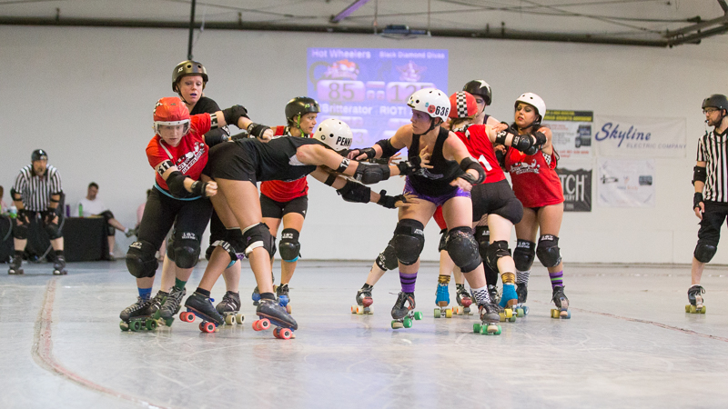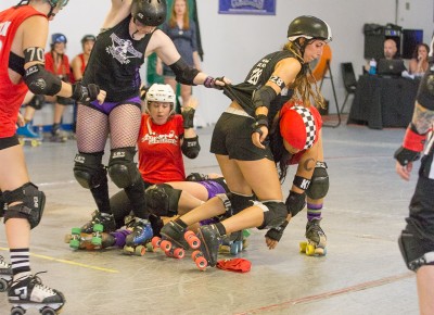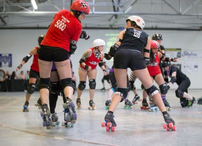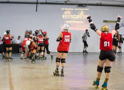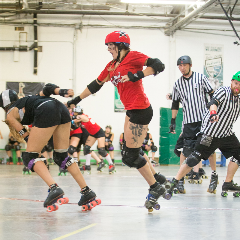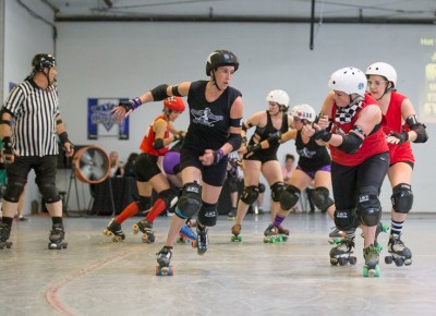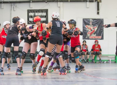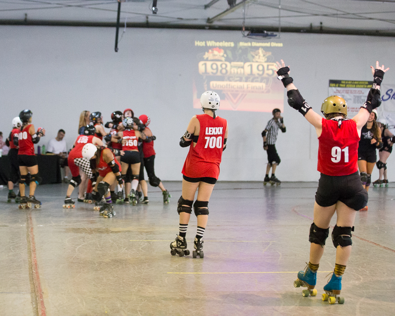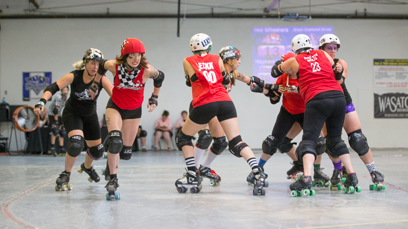 Colorful banners and signs waved, crowds screamed, and a large, white Sasquatch (Sassy, the WRD mascot) could be seen trolling fans for a laugh. Whistles blared and the game began. The Black Diamond Divas started the game in the lead with the help of Sookie Slaphouse, who earned 27 points in a single jam. The Hot Wheelers didn’t go without a fight, though. Triple Lexx continuously blocked the Divas’ jammer, Rainbow Thrash, blocking her into submission, forcing her to pass the star to Sookie Slaphouse. Throughout the first half, Stache Bot 5000, jammer for the Hot Wheelers, knocked down blockers like dominos, whizzing through the pack and scoring points without breaking a sweat. At the end of the first half, the score was 77 HW – 113 BDD. This may seem like a giant lead, but because jammers can score over 40 points in a single jam, the Hot Wheelers still had hope.
