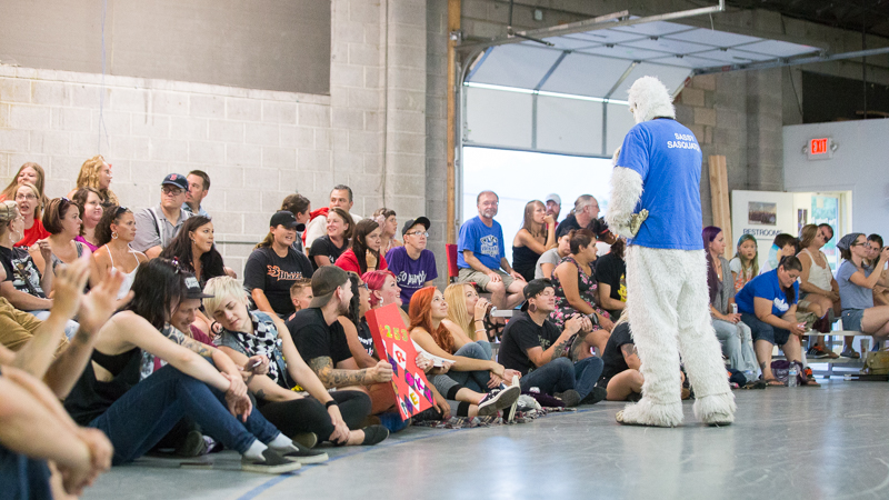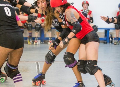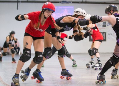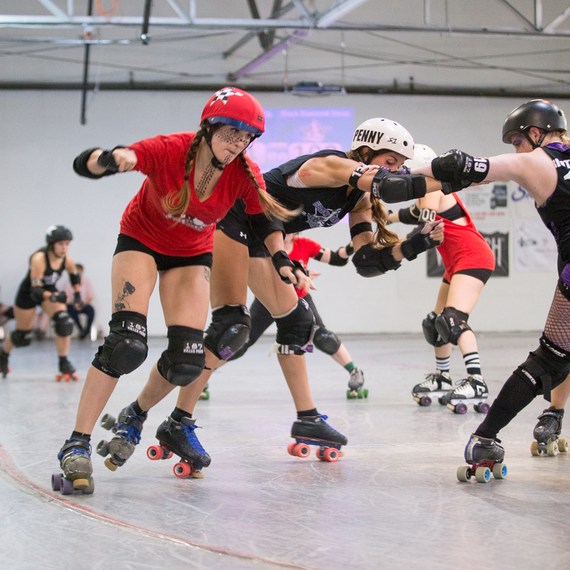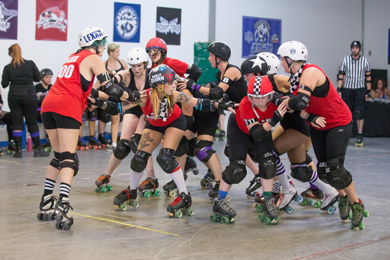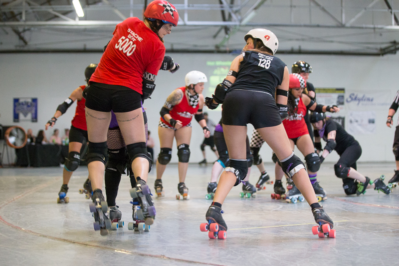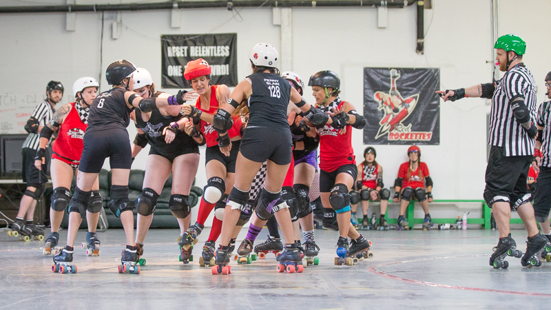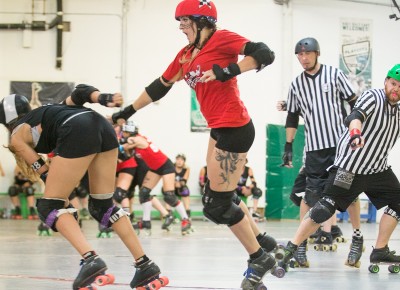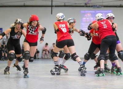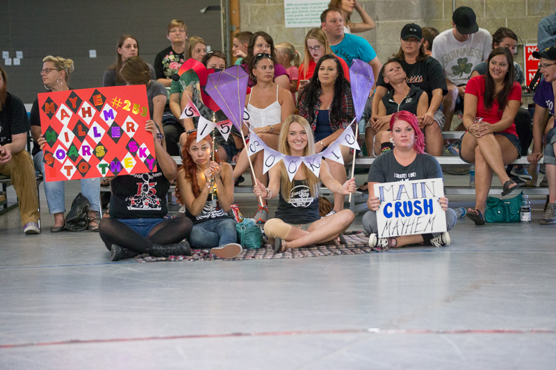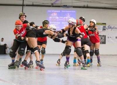 Colorful banners and signs waved, crowds screamed, and a large, white Sasquatch (Sassy, the WRD mascot) could be seen trolling fans for a laugh. Whistles blared and the game began. The Black Diamond Divas started the game in the lead with the help of Sookie Slaphouse, who earned 27 points in a single jam. The Hot Wheelers didn’t go without a fight, though. Triple Lexx continuously blocked the Divas’ jammer, Rainbow Thrash, blocking her into submission, forcing her to pass the star to Sookie Slaphouse. Throughout the first half, Stache Bot 5000, jammer for the Hot Wheelers, knocked down blockers like dominos, whizzing through the pack and scoring points without breaking a sweat. At the end of the first half, the score was 77 HW – 113 BDD. This may seem like a giant lead, but because jammers can score over 40 points in a single jam, the Hot Wheelers still had hope.