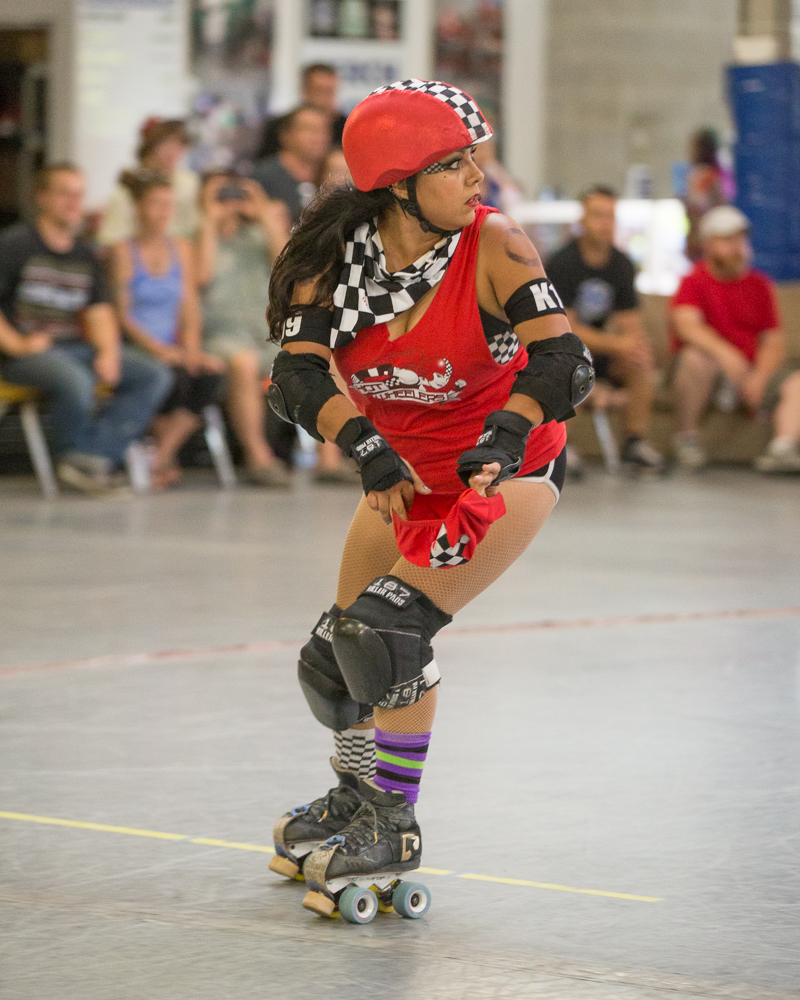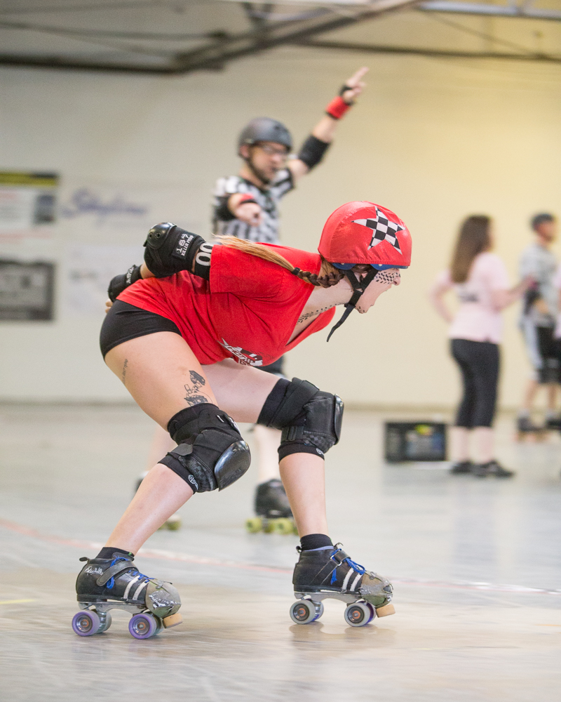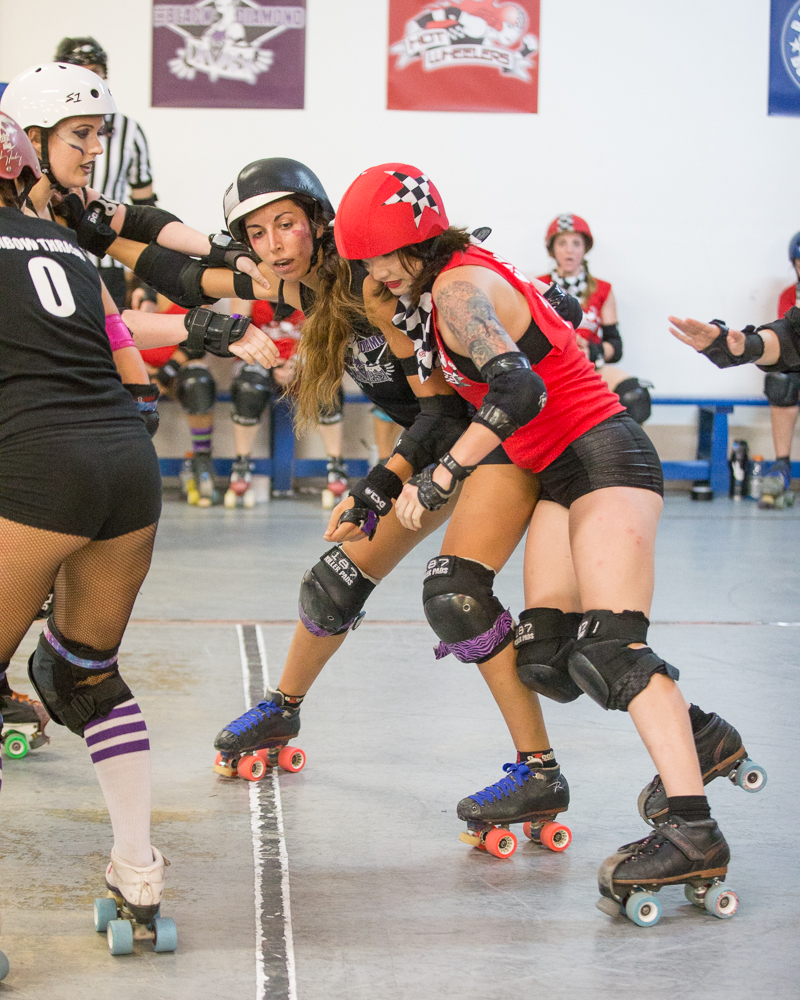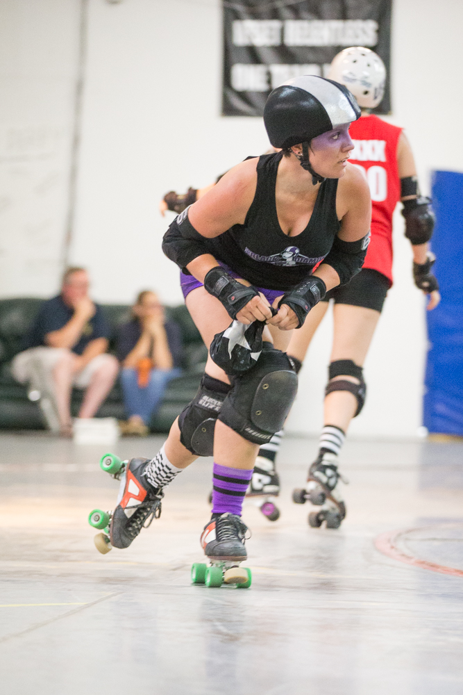 It was awesome to see some of the new skaters WRD had acquired over the summer in action, including one of Junction City Roller Dolls’ jammers, Mayhem Miller. Mayhem was able to add speed, technique and ferocity to help the Hot Wheelers’ offense. I also saw several new skaters on the track I had never had the honor of watching before, such as Rainbow Thrash (jammer for Black Diamond Divas) and Ole Chloe (jammer for Hot Wheelers), who kicked ass and took names on the track.