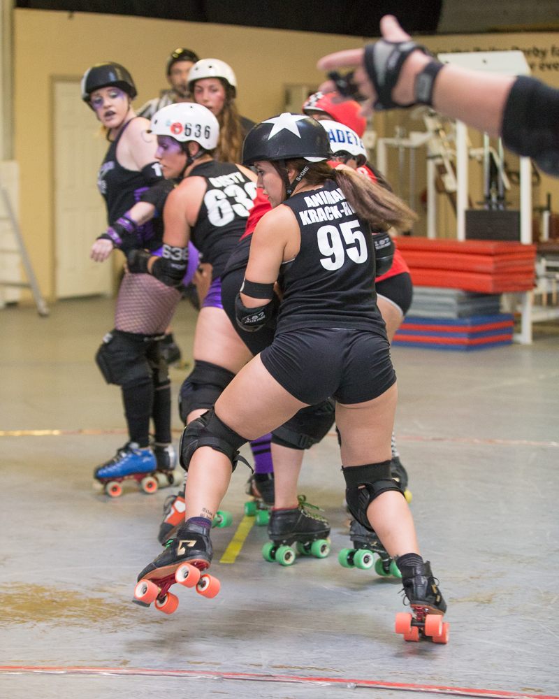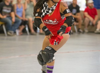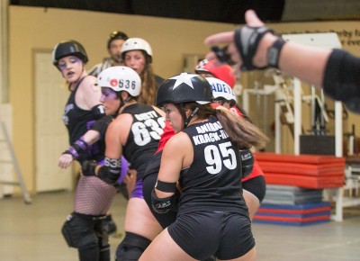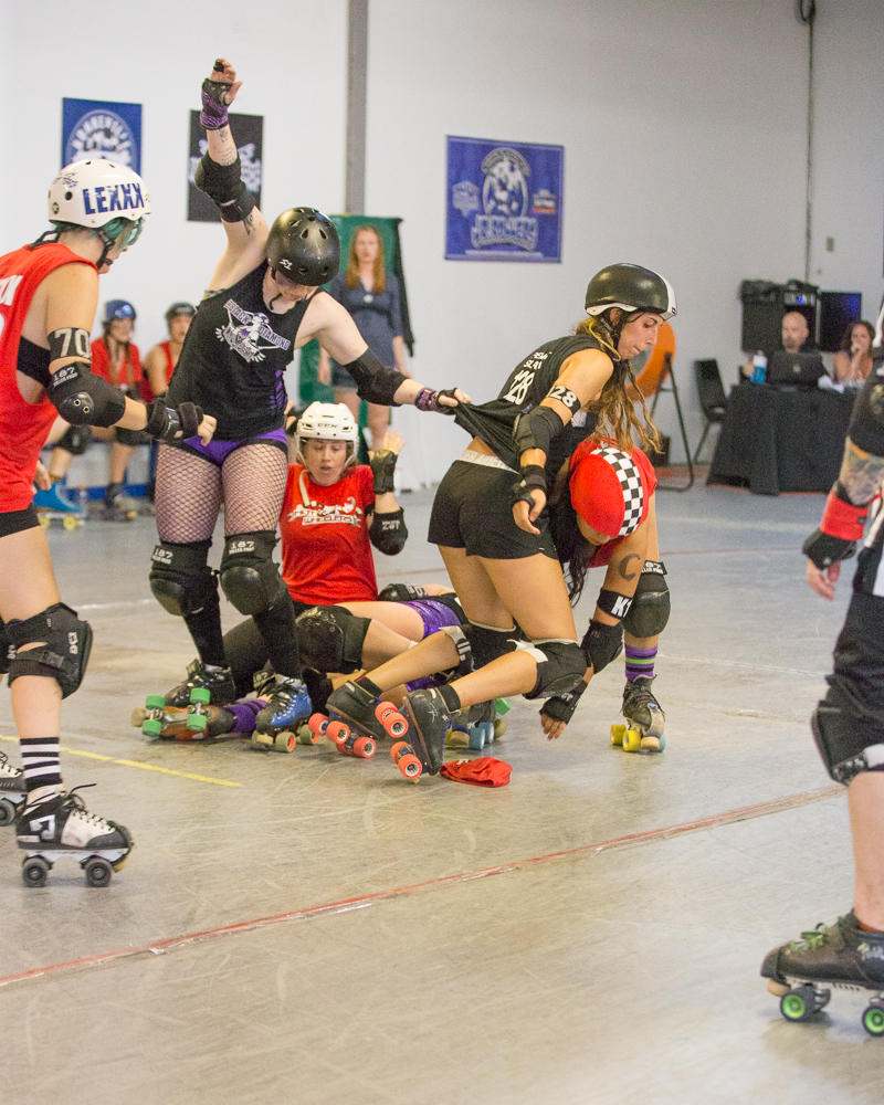 The second half intensified, as the Hot Wheelers ramped up their defense to wall the Divas out. Jammers O’Britterator and Stache Bot fought to score points against the Divas’ tight defense, consistently making gains with each jam. It was amazing to see the progression in O’Britterator’s jamming ability, as she laterally moved and juked to get past the blockers. In Jam 13, Stache Bot skated in a power jam, going neck and neck with the hard-hitting defense of Bust-Em Buxom (BDD). Although Stache Bot was hit out of bounds by Bust-Em, she was able to tie the game. The Divas continued to fight, with Animal Kracker having the highest scoring jam of 22 points. Animal gracefully skated backwards, spinning around defenders and barley getting scathed, thanks to her fancy footwork. The Divas came back in the lead for a few jams, until Stache Bot skated onto the track.