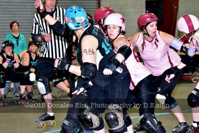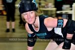 As the teams lined up on the track, on sight alone they seemed evenly matched. If you did not know the background of the two teams, you might be expecting a close-fought game. The first jam started and the Sacrificer’s jammer, Ariel la Twister, took the position of lead jammer, passing through the pack several times and earning SCRG 20 points.  The SCDG defense effectively held the JCRD jammer, Pickles, and kept her from scoring any points.