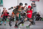 And it so it continued, with Hot Wheelers always seeming to stay ahead of the Fallouts points-wise, but not without some great defense from Fallout blockers. With only two minutes left of the first half, Arc Flash, lead jammer for the Fallouts skated hard and scored her team points, but as the clock ticked down, the first half ended at a score of Salt Flat Fallouts 48 to Hot Wheelers 76.