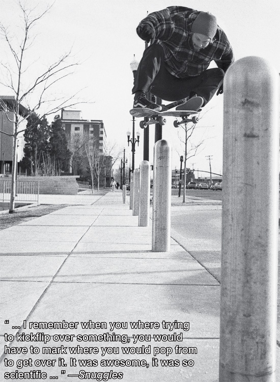SLUG: I’ve heard about some of your skate theories and methods that you’ve adopted over the years like the Man Hole Theory and chalk lines to mark your pop spot. Talking with Snuggles, he said, “I remember when you where trying to kickflip over something you would have to mark where you would pop from to get over it. It was awesome, it was so scientific. You would be kickfliping over piles of snow and with chalk you would mark where you had to pop from to get over the piles of snow.”