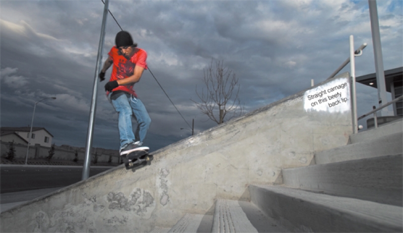 During the course of trying to get photos for this, our crew headed down to Vegas twice. The first time was a passionate, yet idiotic attempt to bluff out the rain and put the phrase, “It’ll be dry in an hour” to the test. That trip resulted in a swampy indoor park session with two lines in the whole place and 80 kids slamming heads midair. The second trip was picture perfect besides the fact that Pablo left his board back at home in Utah. Luckily for us though, Pablo’s woman brought it to him that night or shit would have hit the fan. Pablo gets hyped on all sorts of shit, and will usually pull through with a trick at any given spot, even if it means getting broken in half. Even just sitting in the background daydreaming about those RDS lifestyle photo-shoots because he forgot his board, Pablo will look good doing it.