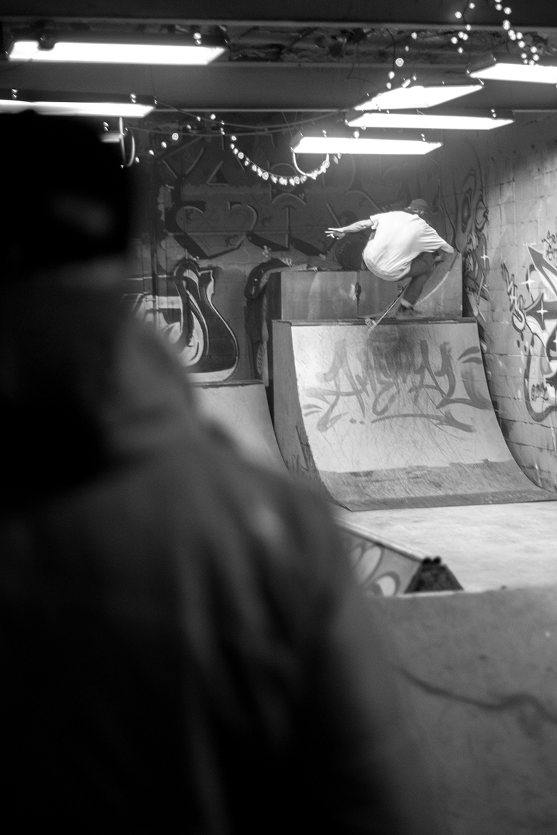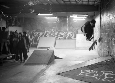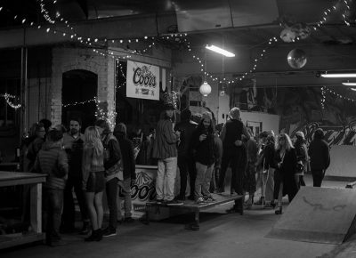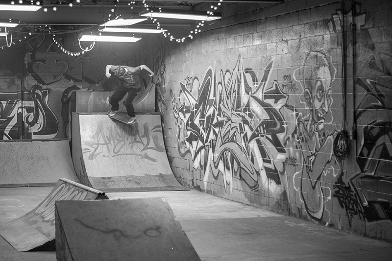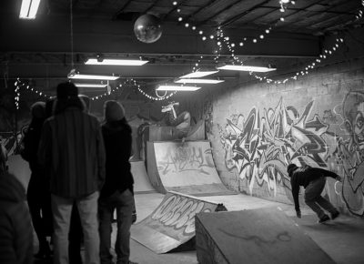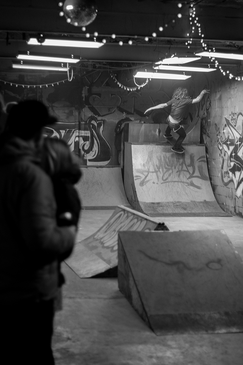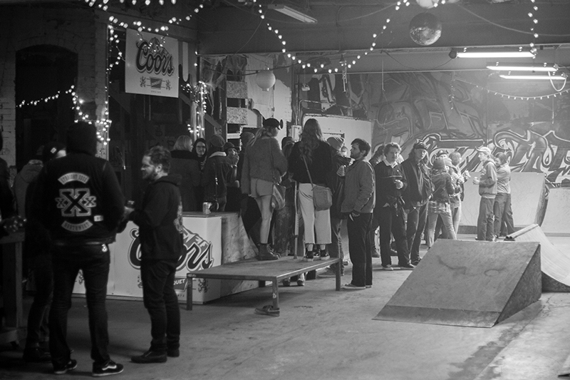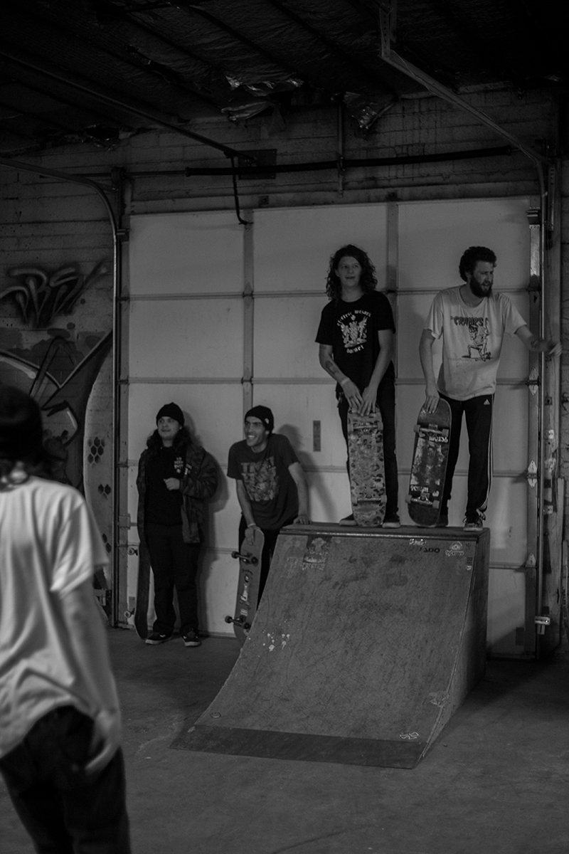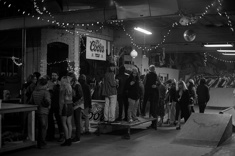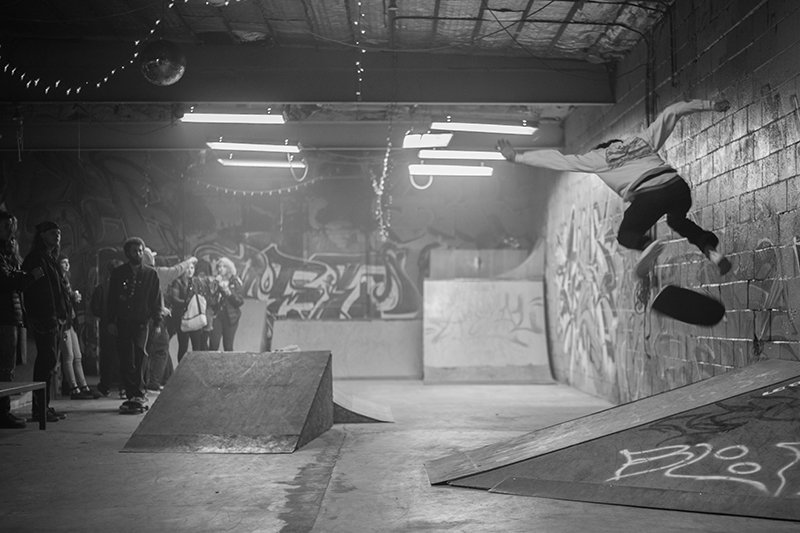 The Skate Warehouse Rebuild The Ramps and Roof Party was on a chilly January night in SLC. As with any normal skate jam/concert, you pull up to a warehouse, walk through the door and walk into a building filled with smoke, loud music and good times happening in every direction. The coolest part about the whole thing is the skatepark inside being shredded by some local rippers—flying out of the quarter pipe at the end of the warehouse, occasionally hitting the lights hanging from the ceiling. All around, it was a kick-ass party with kick-ass people, and I really hope they end up putting another one together soon. The gallery below is a showcase of all the festivities that happened at the