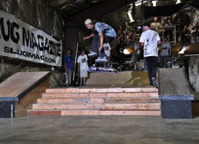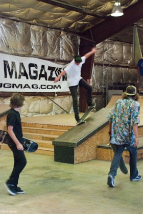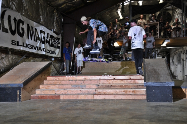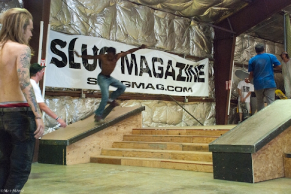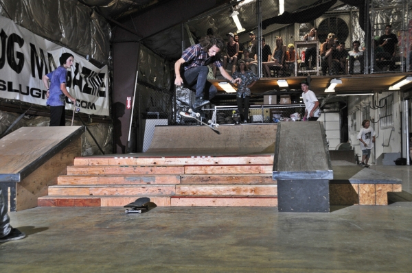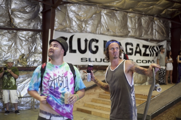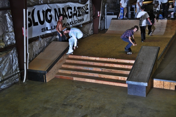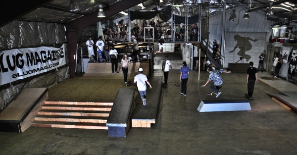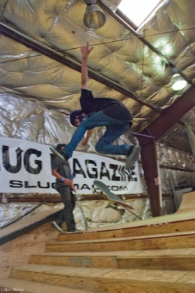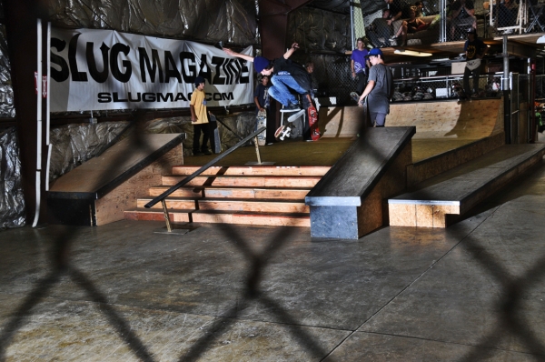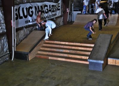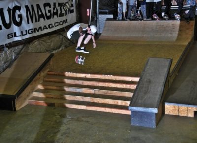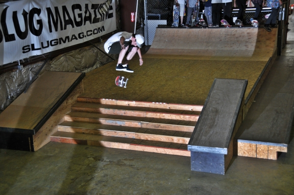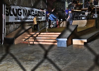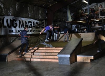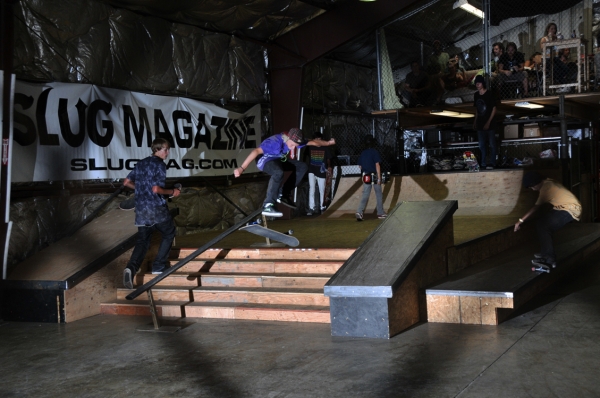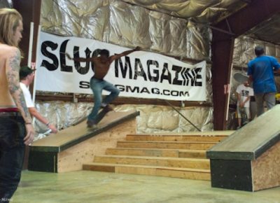 On July 16, SLUG Magazine’s Summer of Death skateboard contest series celebrated its twelfth anniversary with the Pajama Jam, presented by Quiksilver and Natty Light. This year, the tradition continued at the Skate 4 Homies warehouse and we couldn’t have been more excited with the park that Todd Ingersoll and friends built. The main feature, which saw the majority of the action, was a mini-ramp drop into a stair set with a hubba and a handrail. It could also be hit from the opposite direction with enough speed. The rest of the course featured various rails, boxes and ledges with a four-foot quarter pipe on the far end. Up for grabs this year were skate decks and swag for all the podium skaters, and cash prizes for first place Am, second place Open and first place Open.