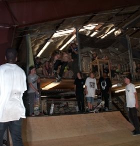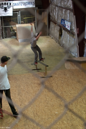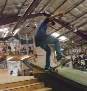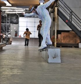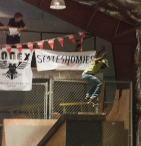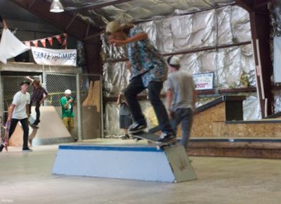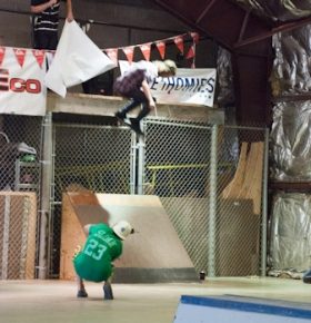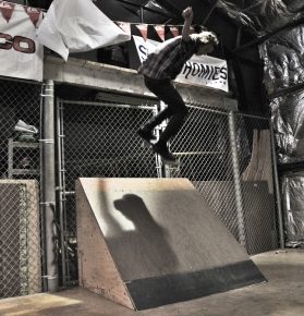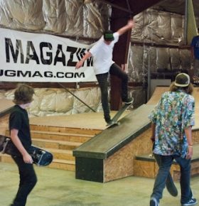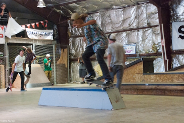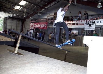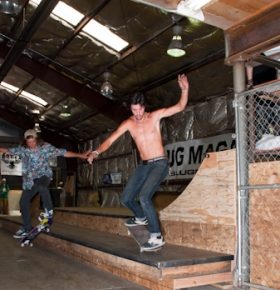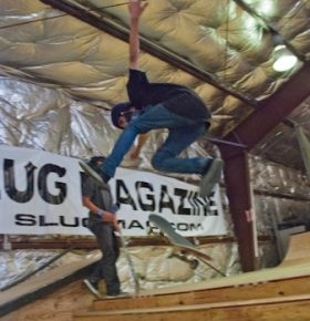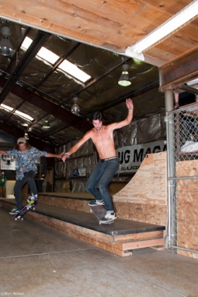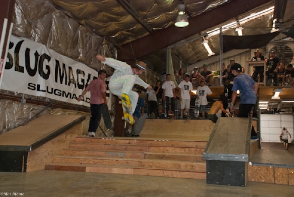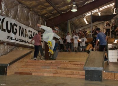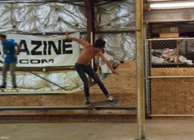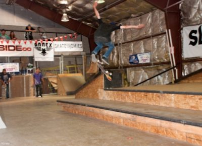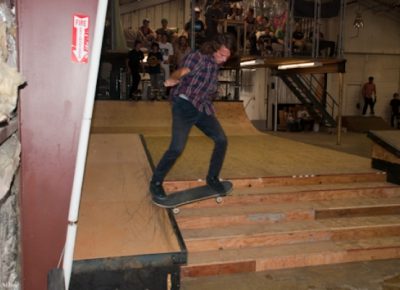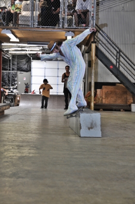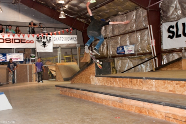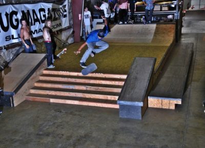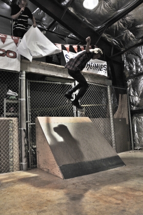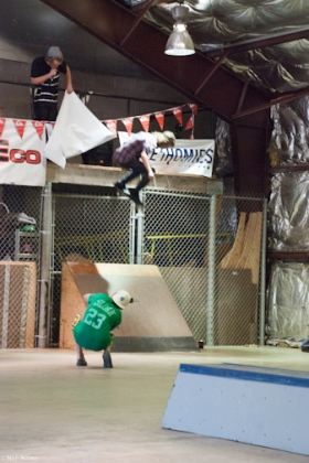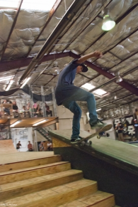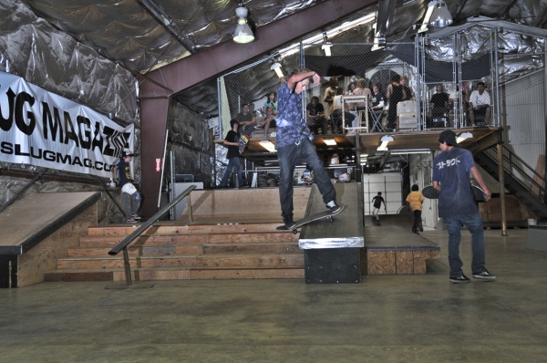 On July 16, SLUG Magazine’s Summer of Death skateboard contest series celebrated its twelfth anniversary with the Pajama Jam, presented by Quiksilver and Natty Light. This year, the tradition continued at the Skate 4 Homies warehouse and we couldn’t have been more excited with the park that Todd Ingersoll and friends built. The main feature, which saw the majority of the action, was a mini-ramp drop into a stair set with a hubba and a handrail. It could also be hit from the opposite direction with enough speed. The rest of the course featured various rails, boxes and ledges with a four-foot quarter pipe on the far end. Up for grabs this year were skate decks and swag for all the podium skaters, and cash prizes for first place Am, second place Open and first place Open.