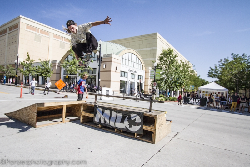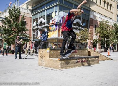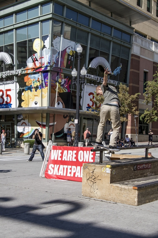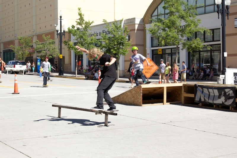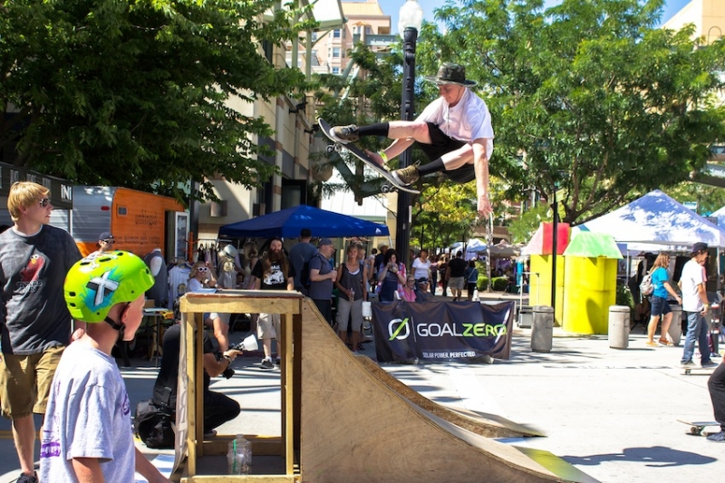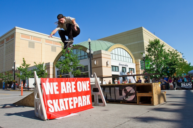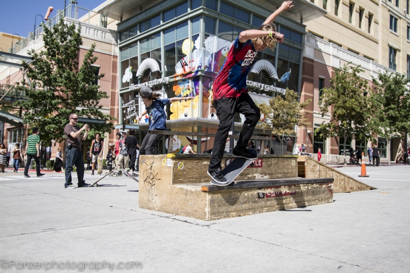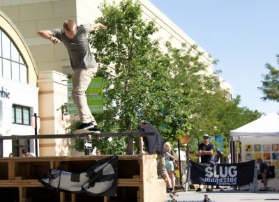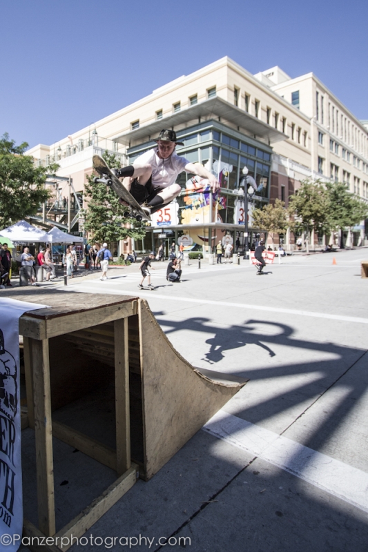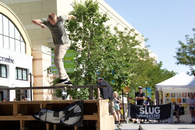 The festival was held at the Gateway Mall where the streets were blocked off to make way for art booths and the skate contest. We Are One Skatepark provided the ramps, which were set up all day for skaters to bounce off of and rearranged for the contest at 3 p.m. The obstacles included in the course were: a flat bar, two different sized, tranny-able quarter pipes, a double step box and a cheese wedge. The contest took center stage at the festival, with all kinds of spectators crowding around the intersection to catch a glimpse of skaters hucking themselves in the air while on their way to look at other forms of art.