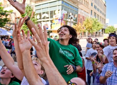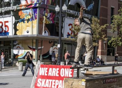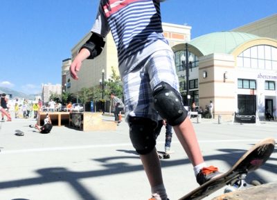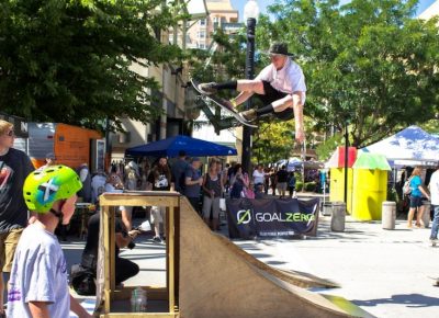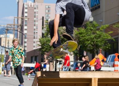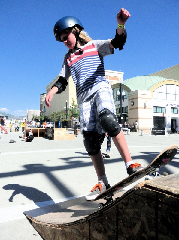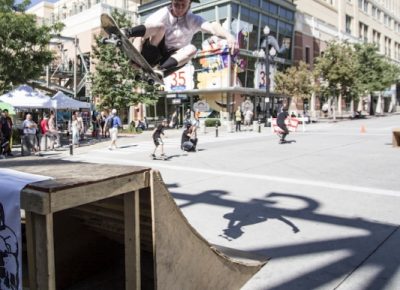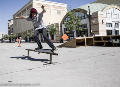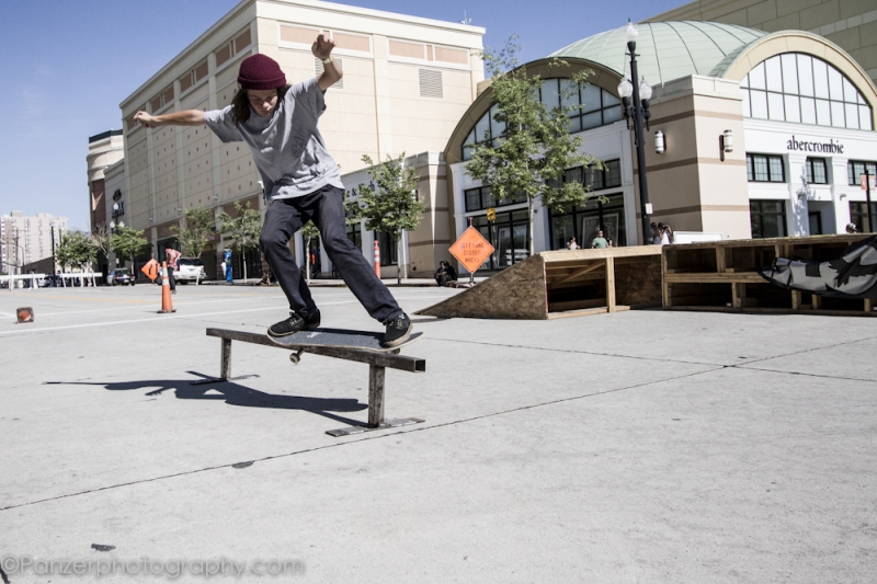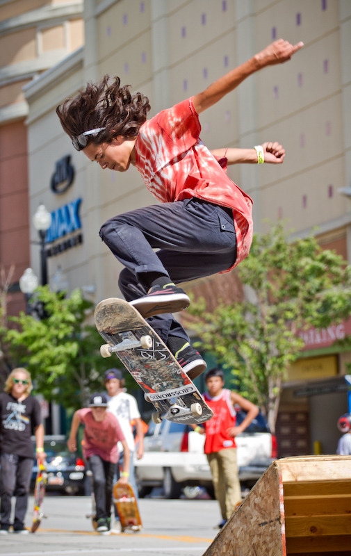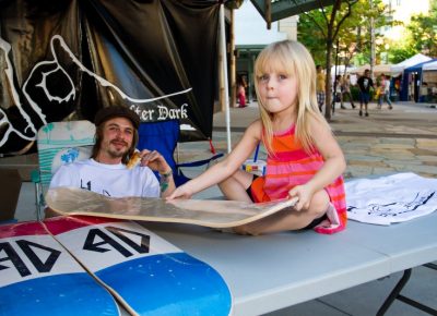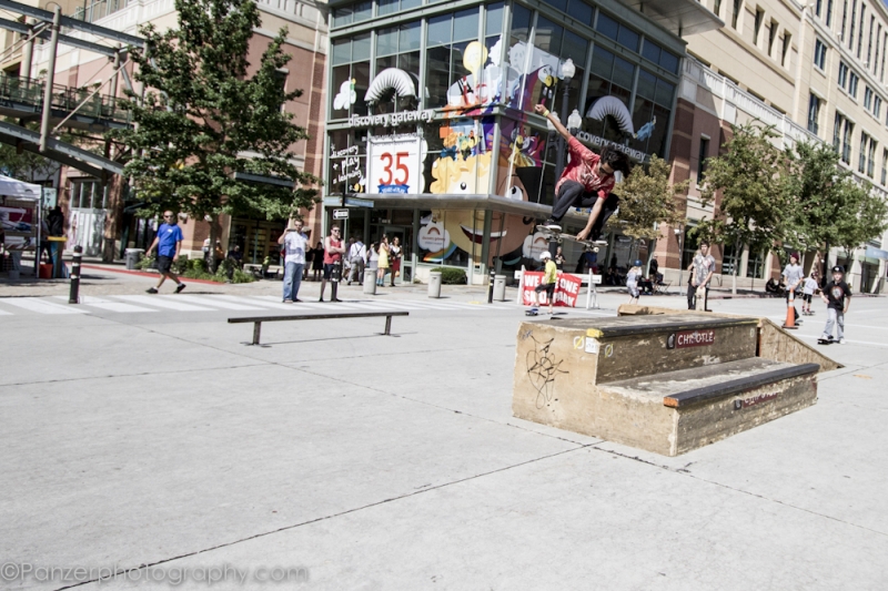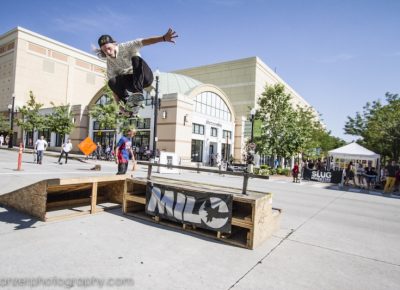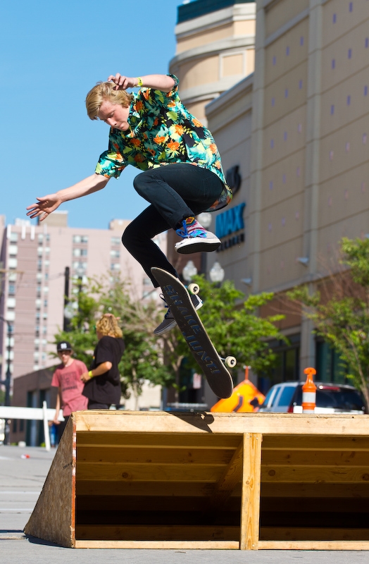 The festival was held at the Gateway Mall where the streets were blocked off to make way for art booths and the skate contest. We Are One Skatepark provided the ramps, which were set up all day for skaters to bounce off of and rearranged for the contest at 3 p.m. The obstacles included in the course were: a flat bar, two different sized, tranny-able quarter pipes, a double step box and a cheese wedge. The contest took center stage at the festival, with all kinds of spectators crowding around the intersection to catch a glimpse of skaters hucking themselves in the air while on their way to look at other forms of art.