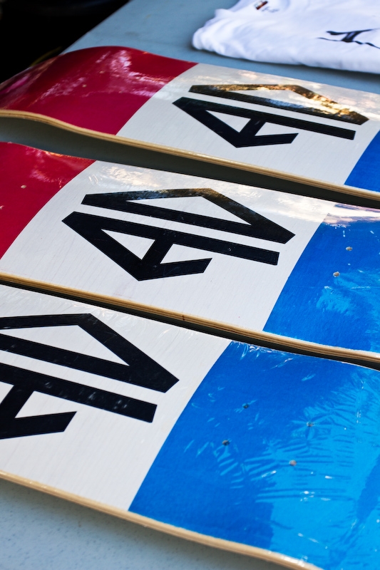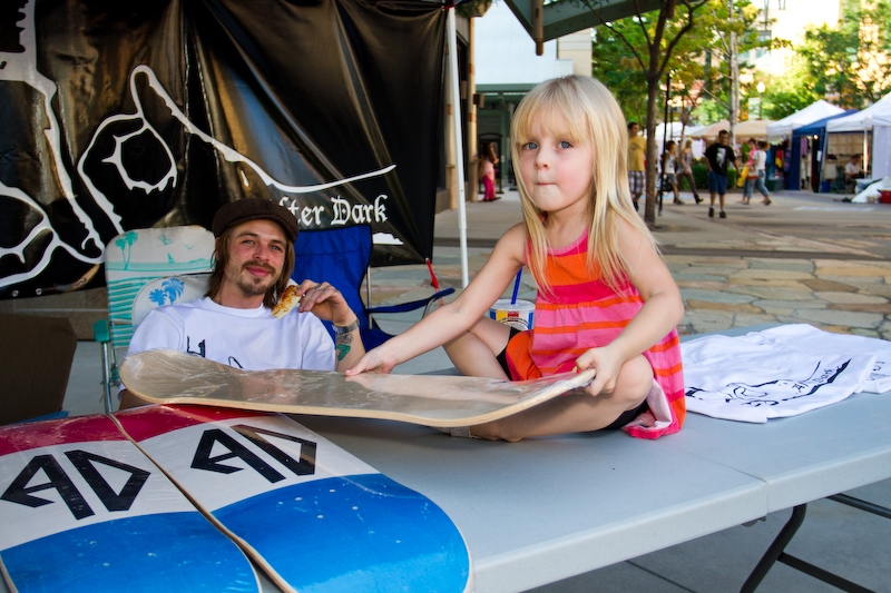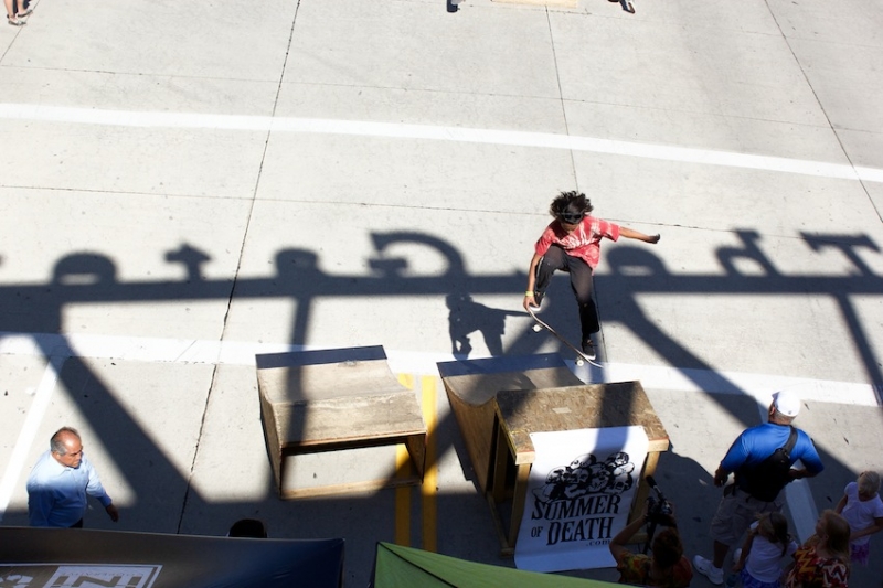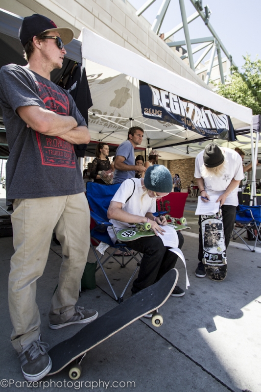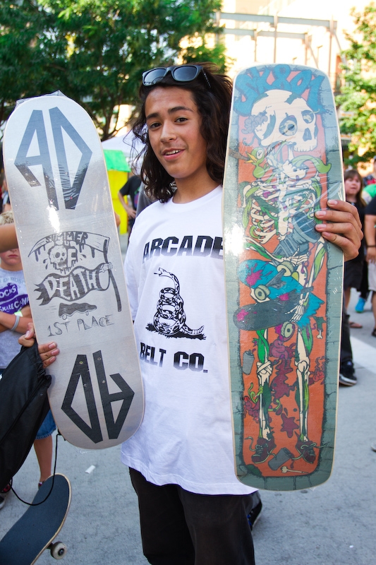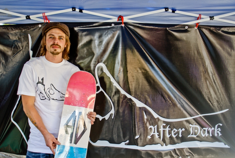 As the contest was being set up, with 45 people registering, I was able to speak with Mark Judd. Judd is the owner of After Dark Skateboards, which has been in business since 2010. Judd handmade the trophy boards being given away as prizes in the contest. He doesn’t just screen-print his graphics on blank decks––he actually presses and shapes the boards himself to his standard, which is AA grade wood from top to bottom sheet. His boards can be found via local companies such as Sk801, BC Surf and Sport, Blindside and Milo, among others. Needless to say, After Dark was a Summer of Death sponsor, and Judd had a tent with some product for sale at the competition.