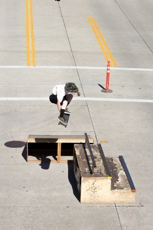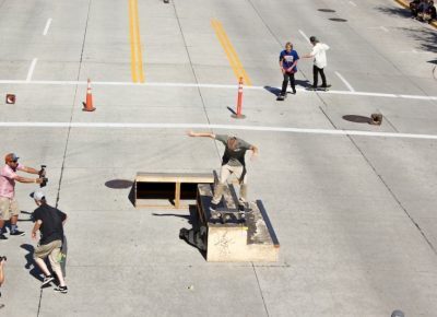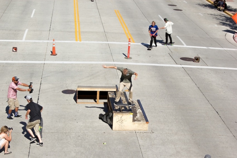 A barrier was put in front of the cheese wedge for the final heat to add even more difficulty. This did not scare Jeff McGrath one bit, who blasted a back 180 melon, benihana, backside flip off the wedge and ollied from the kicker to 50-50 on the lower end of the box—all of these tricks got him Third Place. McGrath shared Third Place with Gailey, who landed a back 180, kickflip to back tail on the box and a tre flip to tail grab over the barrier.