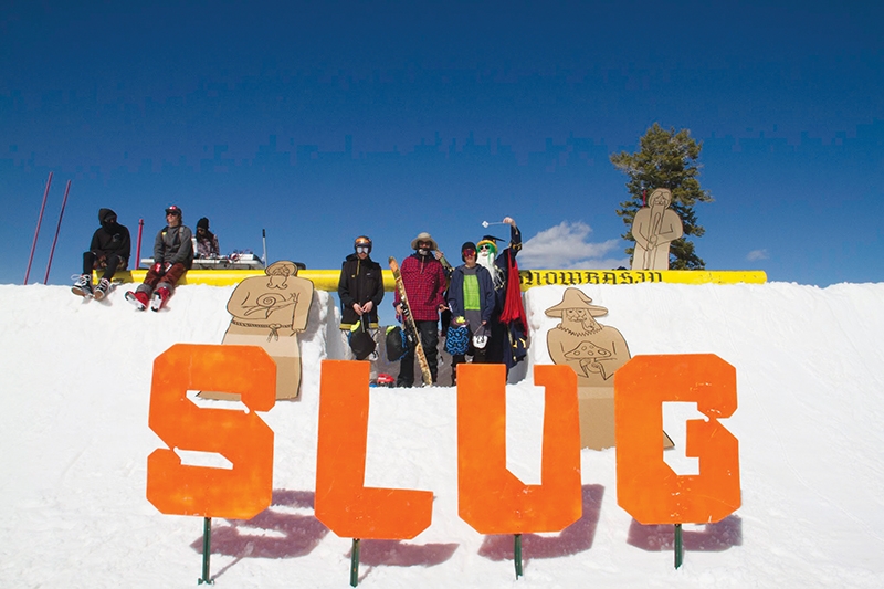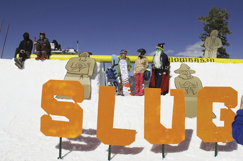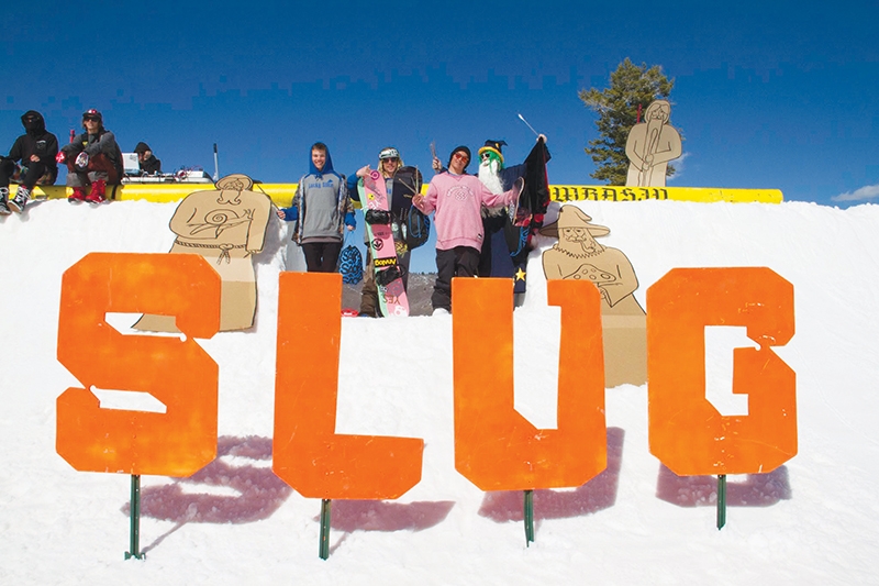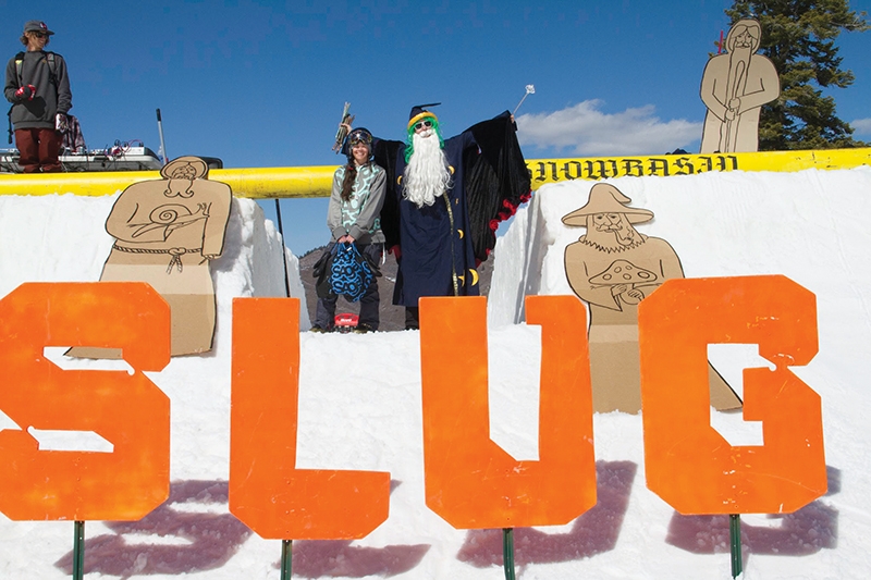 Warm-ups came shortly after final touches were tweaked, and faster than DJ Slap N’ Tickle (aka Jeremy Riley) could take his place atop the 20-foot tall quarter pipe/podium to blast his retrograde-’80s-dancepop-gangster beats, they were off! This was also about the same time that resident wizard and SLUG Games Events Coordinator Mike Brown stepped up on the podium to take a better look just in time to be flown over, as rider Ken Russell gap-to-cardboard-wizard tapped over the QP and judges underhead.  By high noon, snowboard judges Matty Ryan, Blake Payne, Lena Nance and ski judges Ian Wade, Blake Nyman and Molly Morris were in place waiting for the show while emcees BJ Emery and myself laid down the law of the land. It was decided that every heat of competitors, four in all, would get half an hour each to hike the incline-intensive course with finals consisting of the five best riders from each of their respected divisions, all going together for the last half hour.