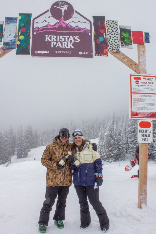 Krista’s Park came about this last July when Doyle, longtime associate of Brighton (her family owns and operates the resort), realized how very few events were around for women and how very few women even entered contests. She called Fisher and told him the idea of creating a women-only terrain park at Brighton in honor of Krista. Anticipating how well received this would be by female athletes, as well as the entire sports community, Doyle and Fisher then collaborated with Burton and Boarding For Breast Cancer (B4BC), a non-profit organization, to make it happen. Krista’s Park opened Dec. 21, 2013. “The park will always just be for women. Not only can we honor one of our dear friends by building this, but it is a chance for females to approach park obstacles without feeling the intimidation of male snowboarders. The features are smaller, and for beginning to intermediate riders, but really, the best part about the park is giving females this opportunity to progress and feel safe exploring their talents,” says Doyle.