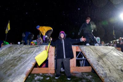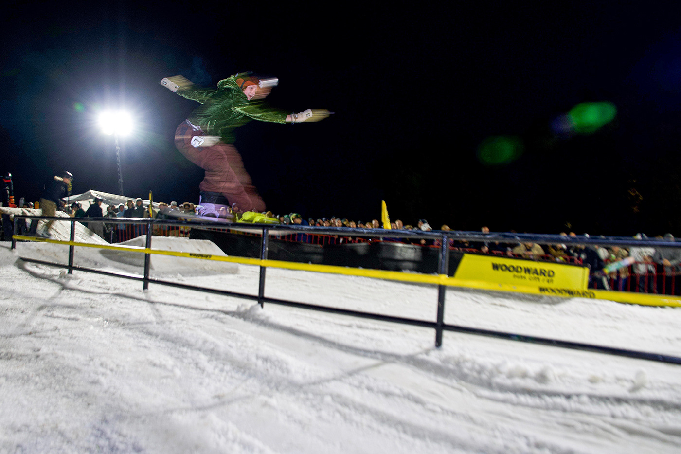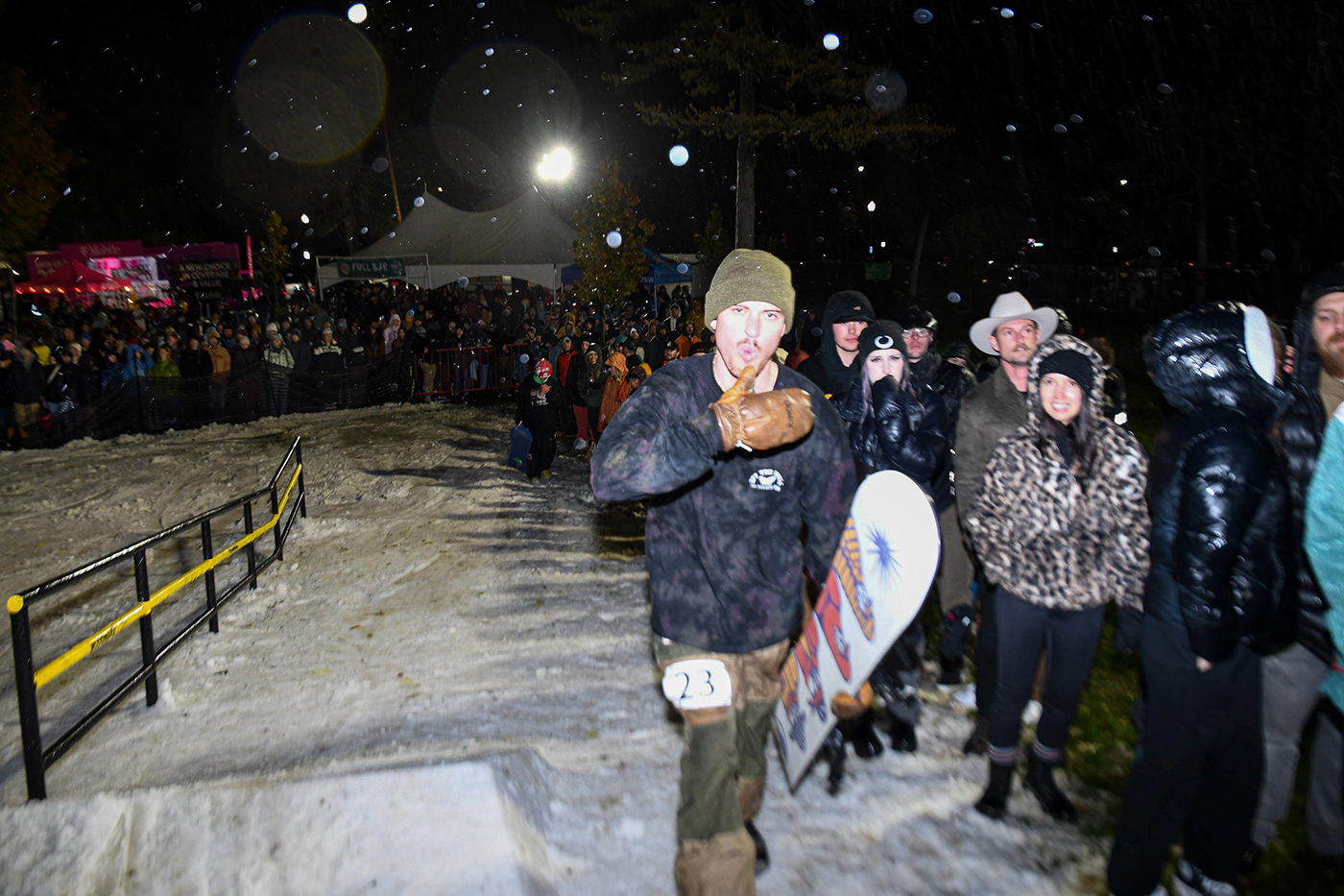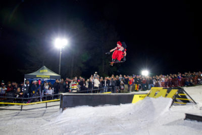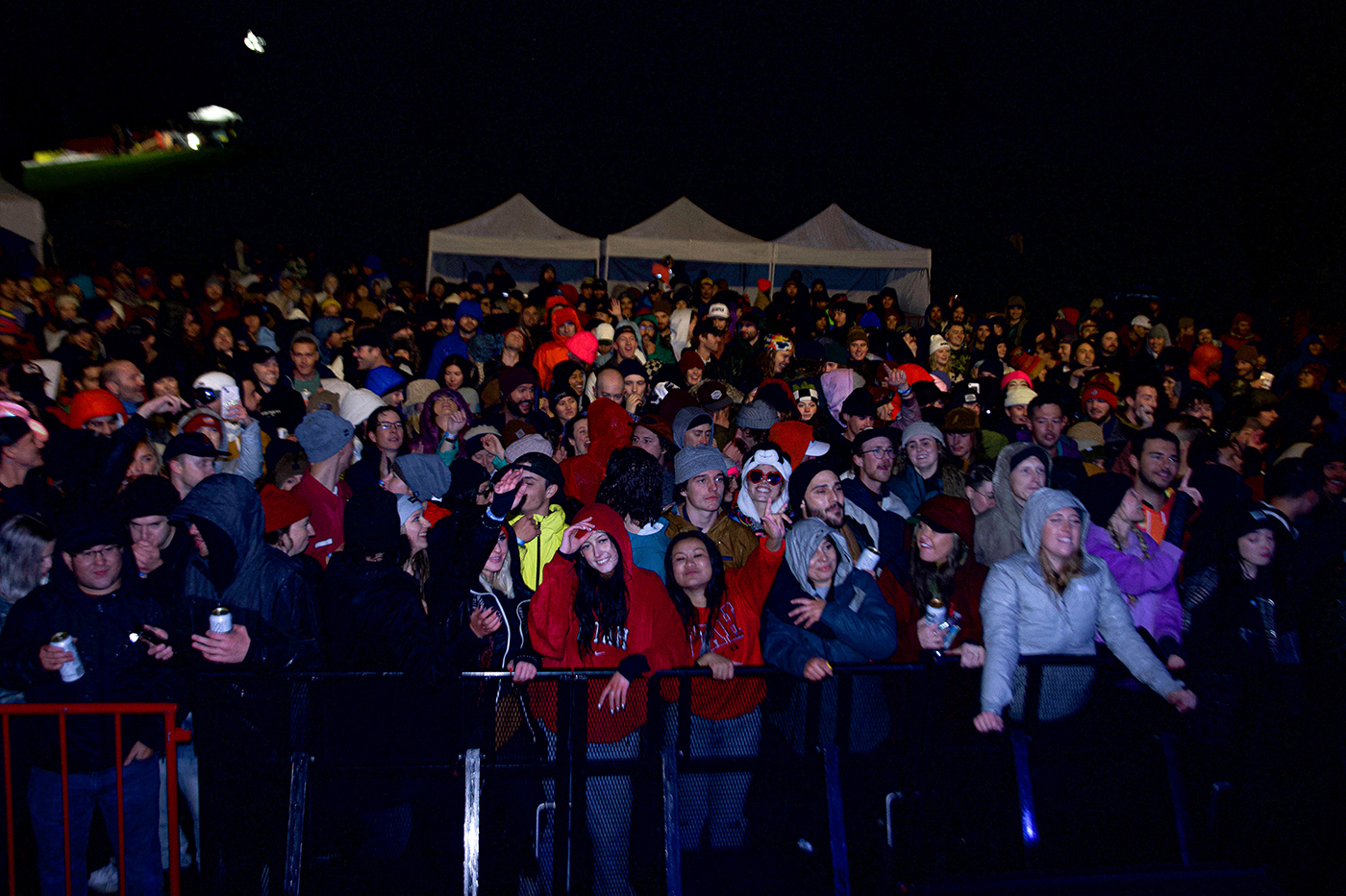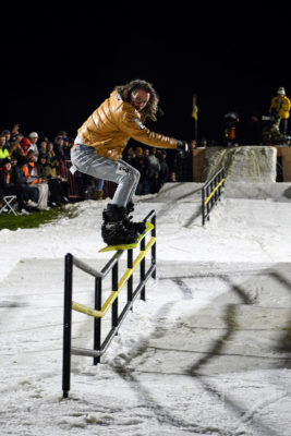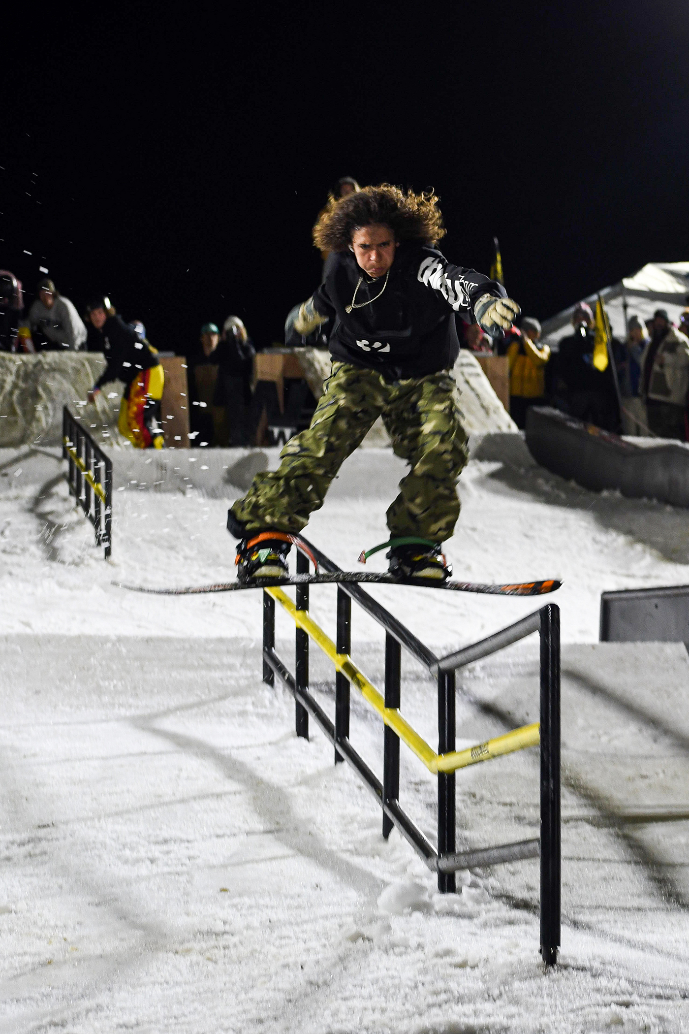 The final run of the night was completed by snowboarder Aidan Hascall. With one broken binding and a foot hanging off the board, he threw and landed a misty flip. All onlookers went crazy, jumping and yelling out to him.
