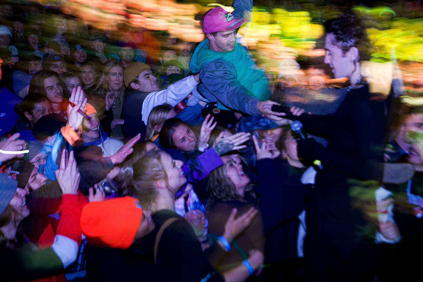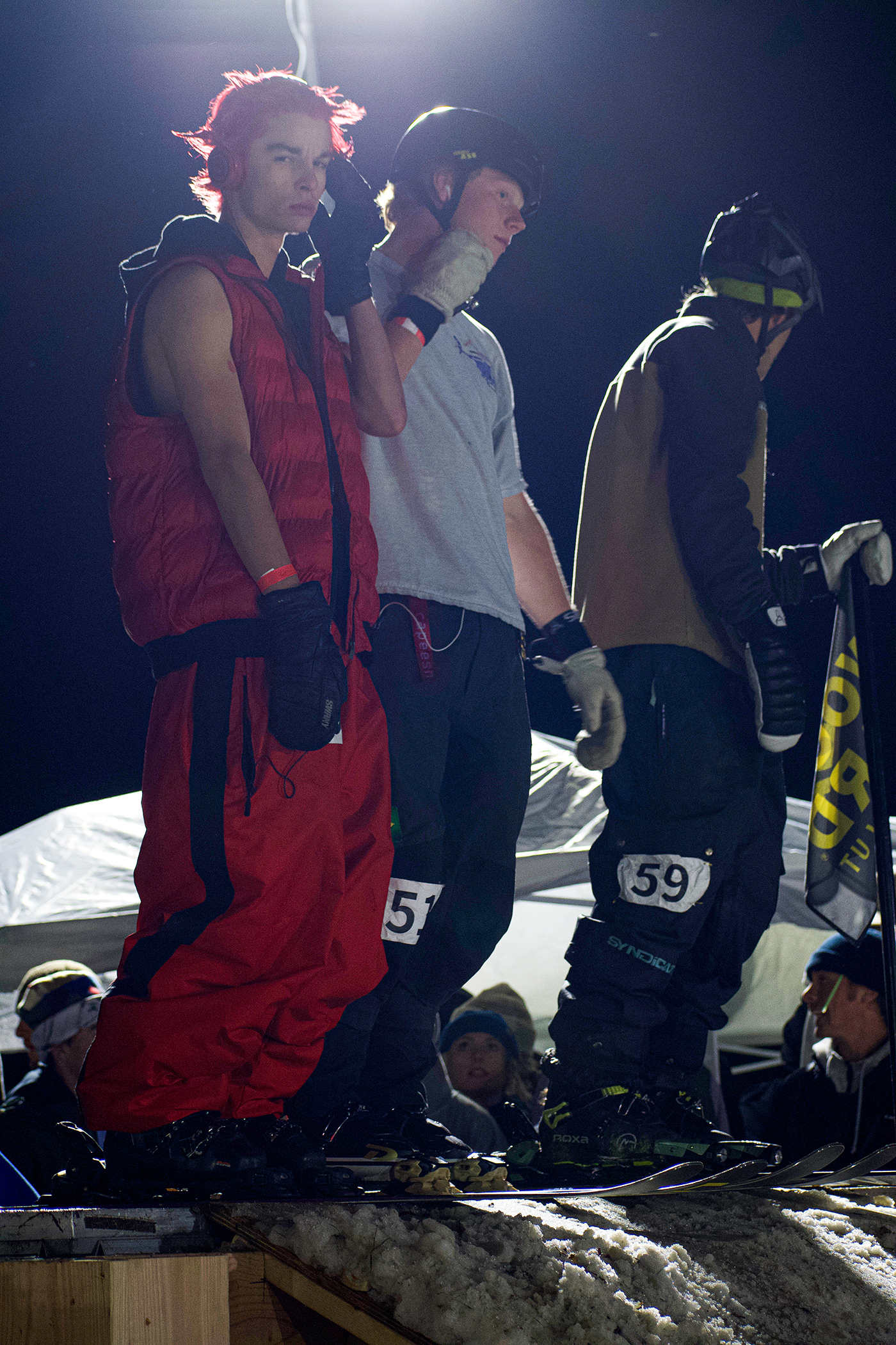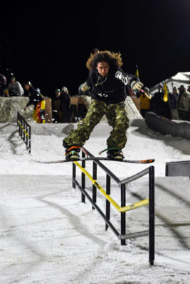The women’s qualifiers were sick, with skiers and snowboarders hitting solid front and back slides, a few tail taps and some 270s onto the rails. Nothing could have prepared me for the aggression that came from the men’s skiers. Off the bat, they skied fast and chucked their hardest tricks. Nathan Thoen, the lead singer from Canadian band Bombargo, participated and was a fan favorite off the bat. Boarding in skinny jeans and a brown leather jacket, he hit a couple Indys for the crowd, who cheered him on as his band members ran onto the snow to record him. Another fan favorite was Noah Rodarte, who dressed in big, red pants, an unzipped red vest and fiery-red hair styled in spikes. He had a rockstar persona that people couldn’t help but notice, and he fed off the crowd’s energy. By day two, the crowd had nicknamed him “Diablo.”