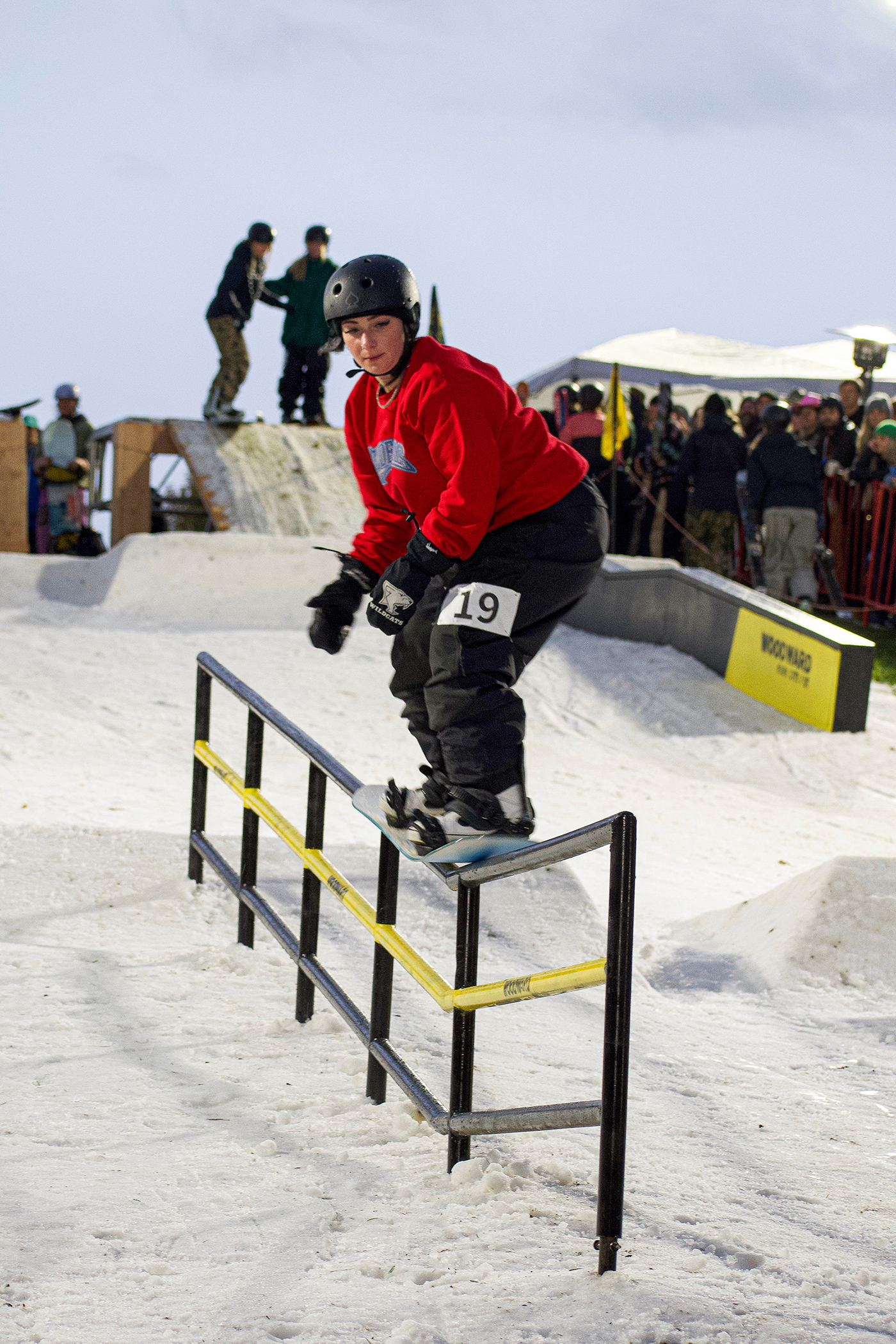 Soon, the athletes started to warm up for qualifier rounds. The setup was on the small hill on the southeast part of Liberty Park, with runs made from synthetic snow. Features were set so that two competitors could shred at the same time—two rails beside each other at the top and two at the bottom. I met Sloane Gordon, who has been running the rail jam for five years. “There used to be 40 people at the rail jam; now there’s 80, so it’s pretty much doubled in size,” she said. Gordon was excited that there are now women’s rounds with equal prize money, something that hasn’t always been done. Additionally, the competition has developed past its local focus. “When I first started, it was a lot of local riders which is always exciting, but now there’s kids who fly in for this stuff,” Gordon said.