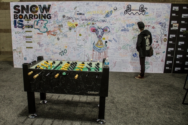 All of the shiny new things and business schmoozing is one thing, but what really caught SLUG off guard was the apparent emphasis of board incorporation into SIA’s 60th anniversary showing. It started with the wall. The wall plainly stated, “Snowboarding is … ” and was filled in by hand by anyone and everyone who had something to say. Consider any quotes vividly describing blowies, face shots, powder, pictures, equality and most emotions straight from the … heart.
