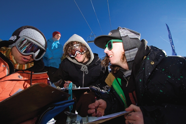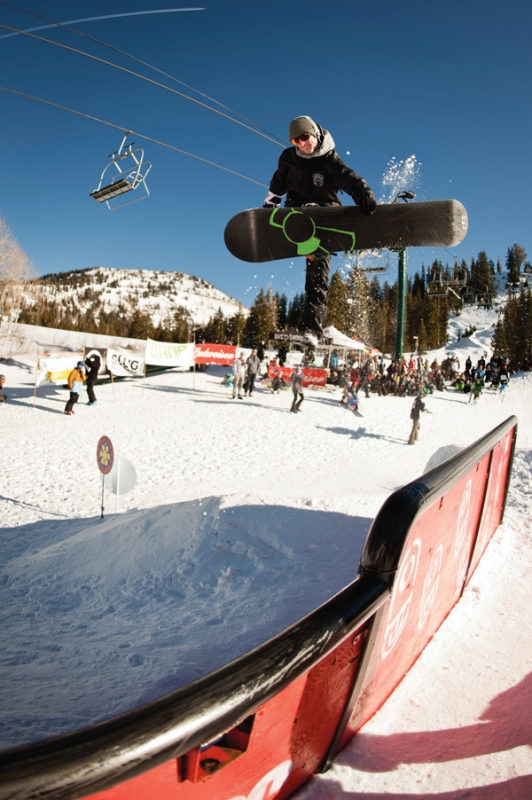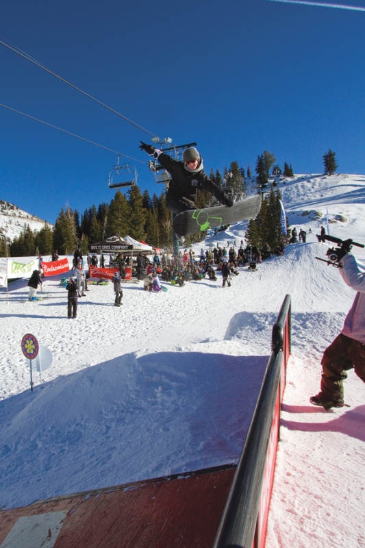 This year’s course, located at the top of the Majestic terrain park, was a one-hit mini park consisting of a double rail, double drop flat rail, wall ride and a tombstone bonk built by the SLUG team and painted by Mike Murdock. With a jam session format, skiers and snowboarders rode in the same heat, but were judged separately by skier and snowboarder judges. The contest started off with the 17 and Under Ski and Snow division.