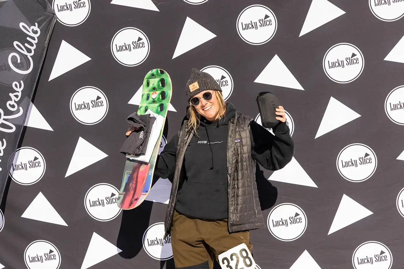 Once the jam session ended and the judges were deliberating, the gals lined up and took turns hitting the hip at the bottom of the course to grab free product from mid-air. When the winners were announced, there were nothing but hugs, high-fives and cheers from everyone, and the event ended with free ‘za from Lucky Slice Pizza.