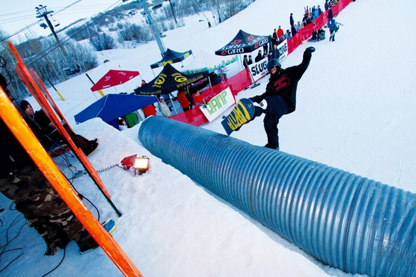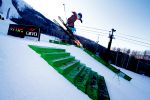The temps began to lower and turn the spring soup into snice (1/2 snow, 1/2 ice) pellets. After completing the short hike to the top of lower 3 Kings Terrain Park, the amateurs were off. Due to the amount of registered entrants and time constraints, 15-plus ams on single and double planks dropped, slid and raced back to the top of the course. Bonks, noseslides, blunts, firecrackers, fast plants, 270 on, 270 off highlighted the makes of the 20-minute session. The corrugated quarter came to serve as a point of interest as competitors tried aerials to appease the judges. With not a lot of vert, many riders found themselves falling victim to “the pit”: the two-foot wide crevasse that separated the competitors from the judges/DJ platform. The first casualty was Tyler Clark. As he attempted to stomp a back flip, wildcat-style on the quarter, Clark under rotated and drifted off the lip, clipped his nose and dented the corrugate. Clark hung out of the pit like a lawn dart, prompting the crew to fish him out. After the time expired, the judges deliberated and the top five skiers and snowboarders were inked for the amateur finals.