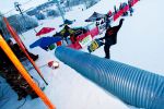 On Saturday, March 10, Park City Mountain Resort played host to Shred the Park After Dark, the second and final contest of the SLUG Games series. With the sun shining bright, deep into the late afternoon, the snow kids (some young, some grown) turned up in droves to compete for bragging rights. With nearly 50 competitors, the table was set for another installment of SLUG-style madness. The course, designed by the SLUG Games coordinators and built by Jeremy Cooper, consisted of three different rail options. On skiers’ right was a round flat-up-flat bar, centered was a short high bar to stair set, and skiers’ left provided a few more choices with a closeout flat bar and a gap to down bar option. All the top rails funneled into a wide quarterpipe with a corrugated coping expanding nearly the entire length of the feature. Corralled atop the quarter behind the SLUG letters stood the MCs, Trevor Hennings and Nick Adams, and the judges. DJ Goobers provided the beats as the competitors stormed the course to get in some valuable practice hits.