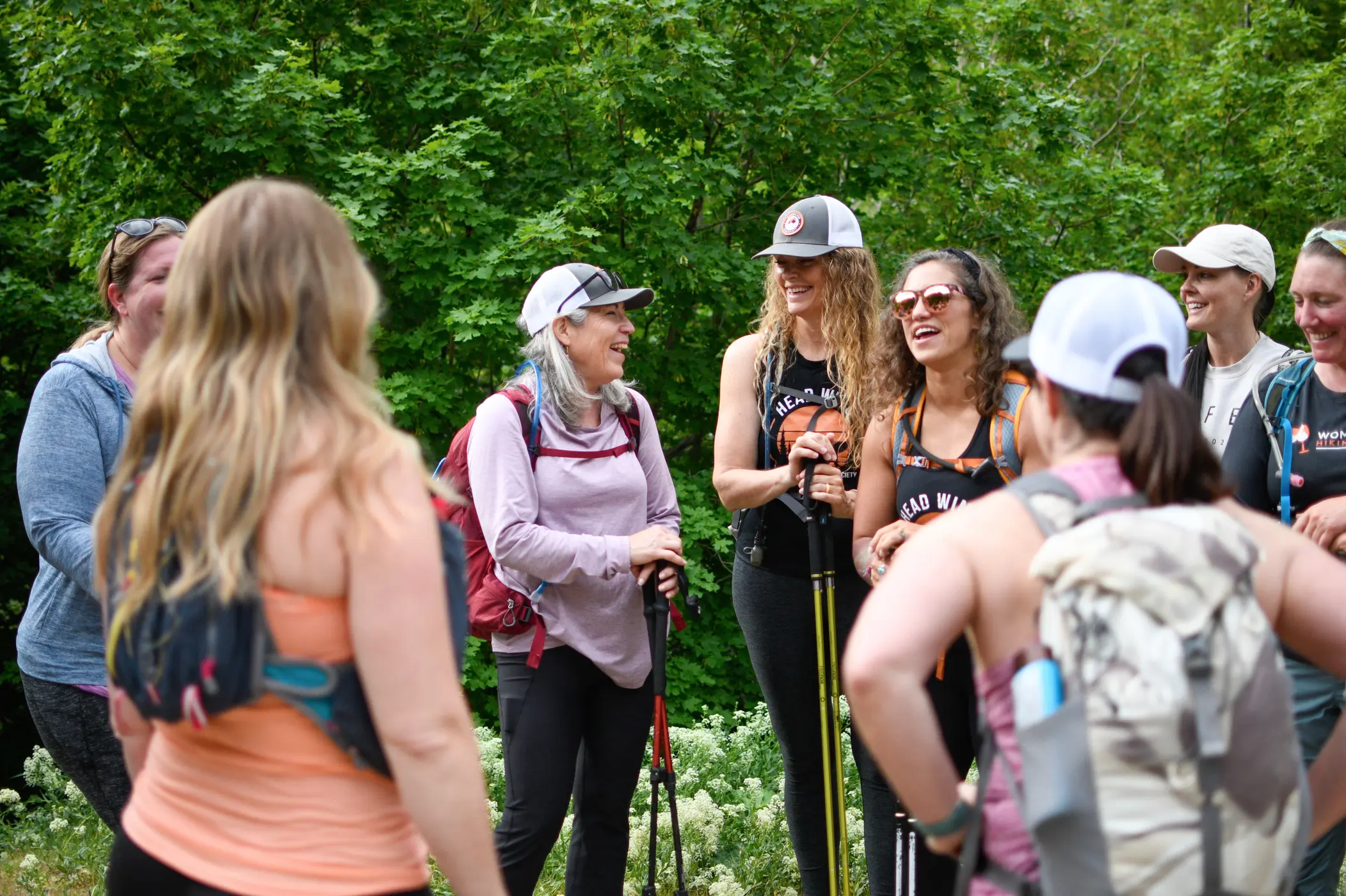 Eight members of the Women's Wine Hiking Society gather and chat outdoors.