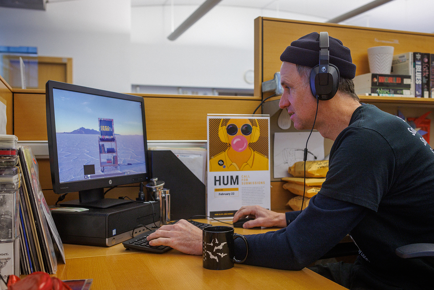 “Hear Utah Music,” or “HUM,” is the library’s portal for local musicians to post their work and house an artist page, as well as make their music publicly available. “Before the pandemic,” Rabb says, “we had been doing a lot of local-music programming at the library: We had a HUM Fest with music on the roof and out on the plaza.” Rabb also coordinated a series called “Shhh,” wherein artists were commissioned for quiet music to be played inside of the library. “Finding a way to continue that tradition of live music at the library, during the pandemic, that all led to HUM TV,” he says.