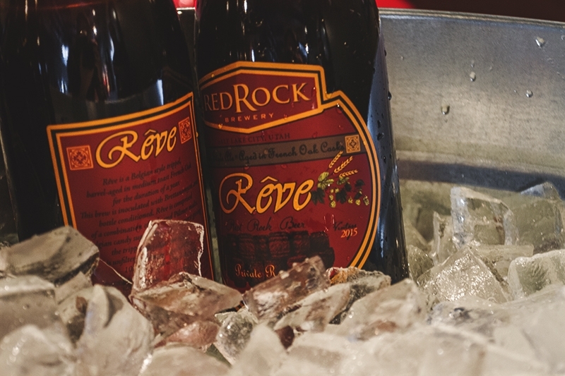 Kicking off American Craft Beer Week on Monday, May 11, Red Rock held a tasting event featuring four vintages of their Rêve, a soured Belgian tripel–style ale. Red Rock first released the much coveted Rêve in November of 2007, and it continually sells out within a matter of days. The gastropub hosted the dinner in their sectioned-off private dining room at their Fashion Place location at 6227 S. State St. The décor reflected the significance of uncorking the 2009, 2011, 2013 and 2015 vintages, as the long tables flaunted regal red tablecloths. Two tulip stem glasses plus two chalices awaited guests at each seat.