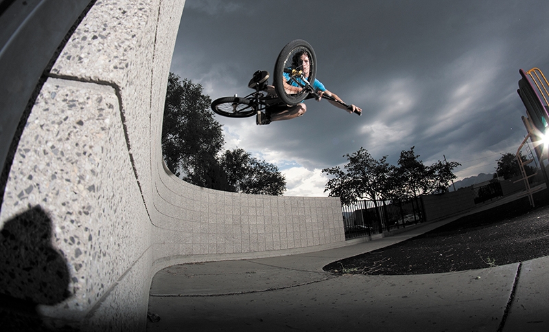 Cam Wood has been around forever. From having standout parts in Killjoy and That’s It, running The Wood Shop BMX shop and riding professionally for S&M Bikes for several years, Cam is someone that needs no introduction. We shot this photo on one of those days, having spent half the session dodging the rain, hoping to pull off what we were trying before it started coming down too hard. This curved wall is in the corner of a playground in a schoolyard on the West Side of Salt Lake City, and Cam had a serious audience of local kids as he blasted around this wall at full speed over and over again. After a few times bombing this thing, Cam locked into a solid table well above the top of the wall. We got the photo, the school kids were stoked, and we managed to get it done just as the rain started coming down for real.