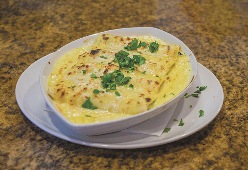 Sicilia Mia: Our cannelloni is an amazing combination of homemade pasta filled with a cheese cream sauce and spinach—we’ll have the bolognese version of it as well, which is amazing, too. It’s like a homemade sheet of pasta filled with a cheese and spinach cream sauce and then rolled, topped again with cheese cream.