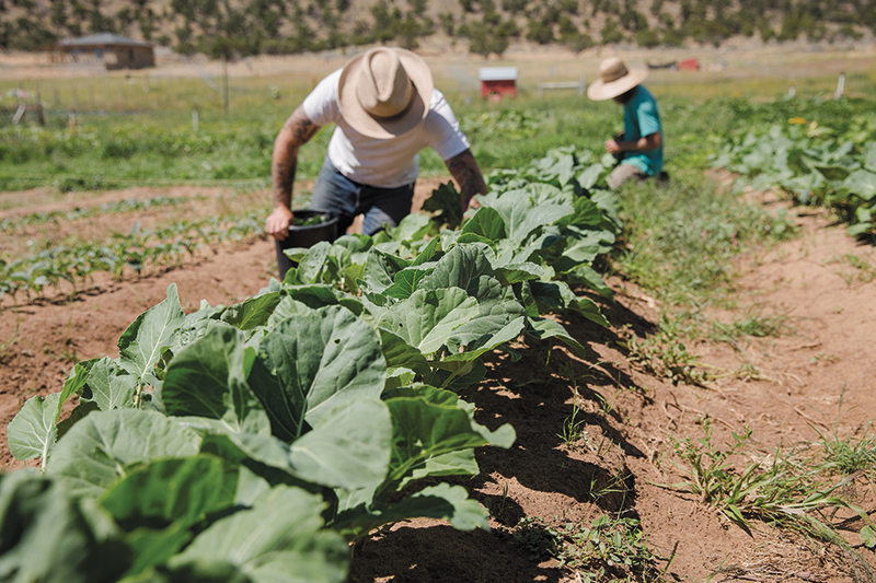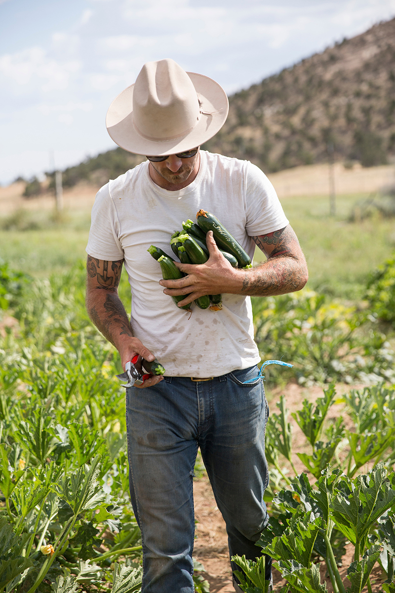 Farm Manager Tony Jacobsen took a break from his work to show me the farm and walk me through this special relationship. His small team exhibited attention to detail and willingness to work hard as they painstakingly hand-weeded long rows of lacinato kale, and scarlet nantes carrots are the standard here. Everything on this farm is done with human power, and the days can be exhausting—no tractor, no weedkiller, no pesticides and no chemical fertilizers. The strict no-kill policy inspired by Spalding’s Buddhist principles extends even to pest insects like the aphids that sometimes infest the plum trees present on the property. But Jacobsen believes that these measures are important to keeping the farm balanced. Speaking of his bosses and chef partners, he says, “Blake and Jen, at no point, have tried to make [Boulder] a different place.” A Utah native, he’s lived all over the state and worked in a variety of industries, including coffee shops and bike shops in Salt Lake City. As his interest in sustainability and agriculture grew, he was connected with HBG and moved down here, line-cooking in the kitchen and volunteering on the farm his first season.