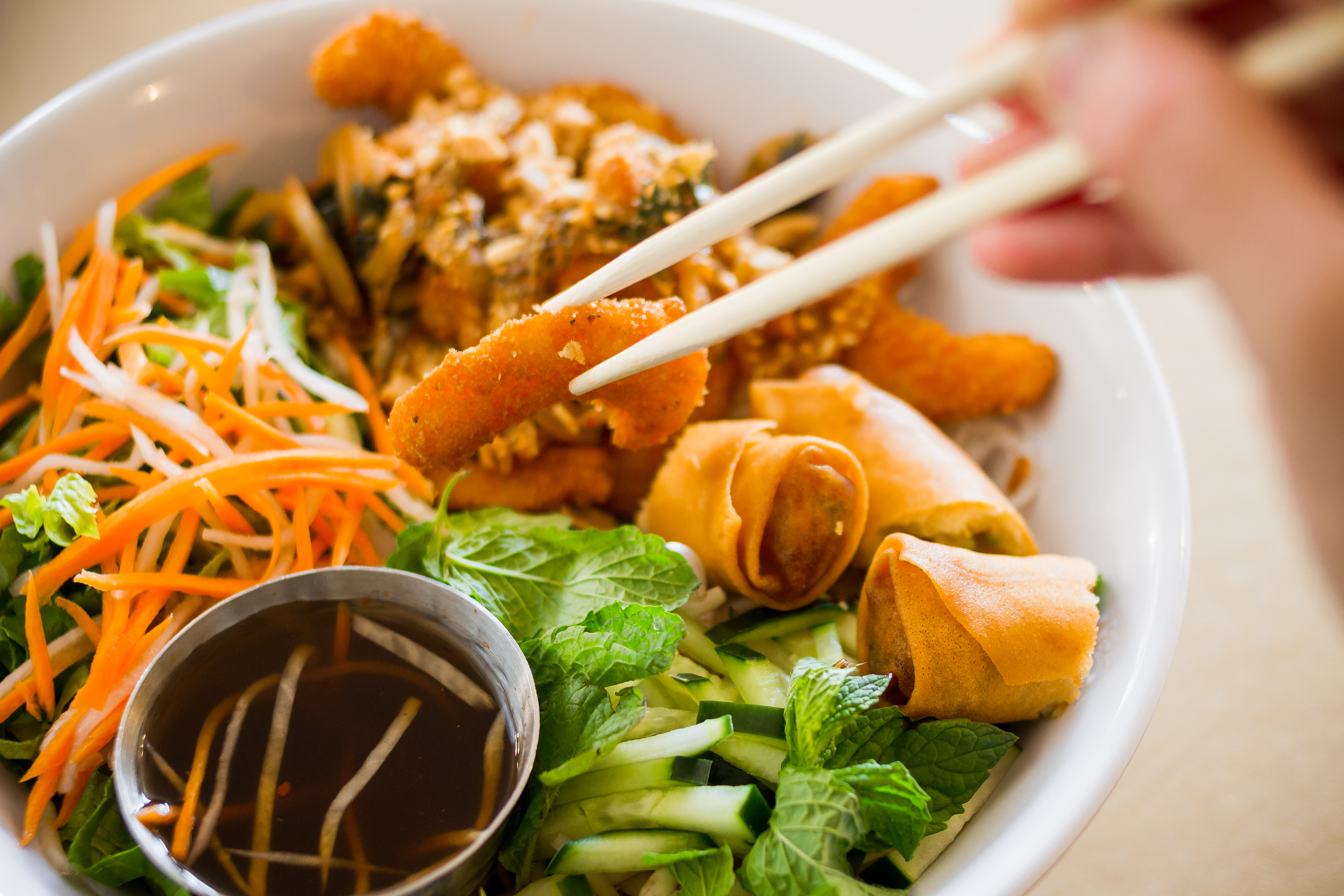 The menu is smartly organized into appetizers, soups, banh mi, rice and noodle dishes. Mix and match your entrée with flavored tofu or mock meats made from soy and seitan, including “chickun,” “beef” and impressively realistic “shrimp.” Order at the counter and take a number. Collect your chopsticks, flatware and condiments from a station in the middle of the restaurant and take a seat. The concise menu means you never have to wait long for food.
