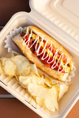 The Sonoran is where Nana’s shines: A bacon-wrapped grilled hot dog topped with beans, cheese, grilled onions and tomatoes served on a soft bun. The first bite might have you feeling transported to Mexico and reaching to adjust your sombrero because it’s THAT GOOD. The soft and snappy textures of beans, onions and meat work together to bring you all the flavor of the bacon-wrapped dog, plus the coolness of the tomatoes and cheese takes the tastiness up a notch.