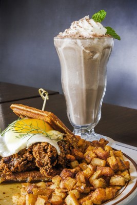 Big words for a big pancake: I think the Sour Cream Flapjacks ($8.99) are the best pancakes ever. They are so delicious that they don’t need much syrup. They’re rich and moist with just a bit of crunch at the edges. Similarly, the Pound Cake French Toast ($6 for half, $9.25 full) sounds rich. It’s just on the edge of too much—a thrilling place to be—moderated by a side of bacon. The Chicken and Waffle Sandwich ($10.50) is awesome, with a fried, juicy, XXL-sized breast of flavorful chicken breaded in a funky flour and spice sheath, inserted between a couple of thin crisp waffles and topped off with jalapeno-infused syrup.
