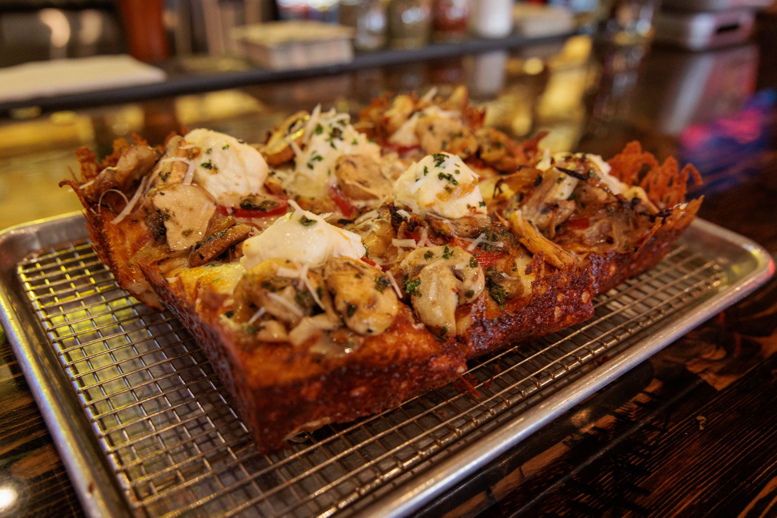 “This white-sauce pizza was covered in delicious, savory mushrooms with sweet, caramelized onions made bright by marinated tomatoes.”