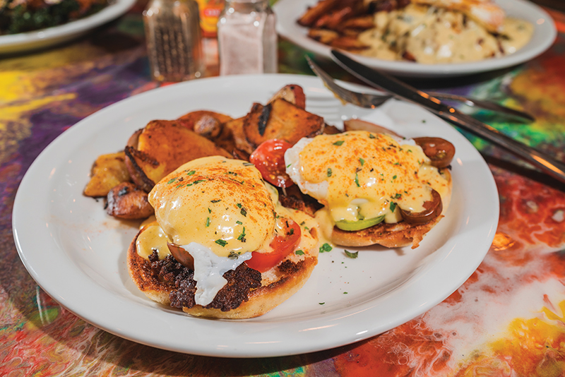 Another great breakfast choice is the Roots B and G ($11.50). This nontraditional approach to biscuits and gravy starts with a pair of house-made herb biscuits. They are layered with your choice of protein and are then smothered in a vegetarian-poblano-chile gravy and topped with two farm-fresh eggs. The home fries also accompany this dish. The mildly spicy, creamy gravy is really something special. The peppers add a certain earthiness and just the right amount of heat to the sauce. Order the eggs over-easy if you want the bright flavor of the yolk to help the dish feel a little lighter. If you’re looking for something to cut through the richness of the meal completely, consider ordering one of their fresh-pressed juices. The Cleanser, a concoction of carrot, apple, beet and lemon juices—with a touch of ginger—is a fresh and cool favorite.