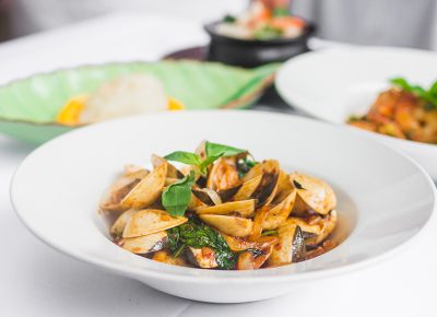 Open-air windows provide a welcoming dining experience. There is patio seating—however, if you would like to enjoy an adult beverage (alcohol), you will need to sit inside. The space itself is inviting with its purple walls and comfortable, casual setting for conversation and enjoying a Thai craft cocktail. Lychee is the basis for Bangkok Terrace’s Lychee Martini, which explodes in sweetness and offers a beautiful taste blended with the accompanying gin. I recommend ordering a Bangkok-brewed Singha beer ($5) off the menu. There is something special about blending a regional beer with traditional recipes of that region.