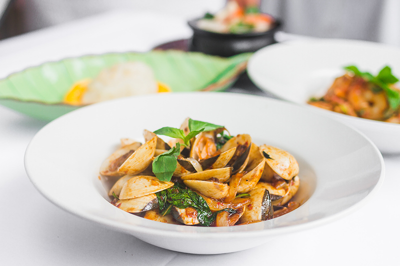 Four main flavorings typically accompany any Thai dish. Salty, sweet, sour and spicy are all fused to provide the palate with a dance of exploration. Putting this theory to the test, we started with the Curry Puff ($9) on the appetizer menu. With a perfected flaky crust, there is no question that this pastry puff is made onsite. Resembling a warm apple pie, the spot-on blend of spice and sweet will leave you begging for more. We also tried a spin on a Shrimp Spring Roll from the Chef’s evening special menu, which perfectly complemented the complex spice of the puff with its delicate shell and addition of fresh veggies in a bit of sweet and salty sauce—a nice and fresh summer appetizer.