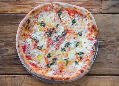 Pizza Nono’s goal, as one of their Brooklyn inspirations, Paulie Gee, described, is to “use really good ingredients on great bread.” And though the pizza is the main star, the cozy simplicity of the restaurant itself offers an inviting first impression to the customer. Diners can sit in the comfortable dining room with a full view of the prep kitchen and wood-fired oven, or they can opt to sit at one of the several outdoor patio tables. Much of the west-facing wall of the shop is made of open bay doors, which create a unique and memorable space by blurring the separation between the inside and outside. If you choose to sit inside, you can watch your pizza be prepared and marvel at how little time will pass before the food makes it to the table.