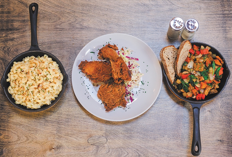Those looking for an early Saturday brunch and those who are more interested in a hip place to take a dinner date will be equally satisfied. The breakfast menu offers choices that are both familiar and unconventional. The Buttermilk Pancakes ($7) are fluffy slabs of goodness—the kind of pancakes that consume the whole plate with their sheer size. While golden brown on the outside, their inner texture is more like that of an eggier German pancake. I recommend splitting an order of these lovelies after sampling the savory breakfast options, such as the Vegan Hash ($9). When an eatery offers vegan food that sticks to your bones, it’s a safe bet that they know what they’re doing. The Vegan Hash is a prime example of this. It’s a hot skillet filled with russet potatoes, sweet potatoes and tempeh—hearty soybean patties that have been diced and roasted along with the other ingredients. A dose of Sriracha makes this dish sing, and the rye toast is excellent for mopping up the bottom of the skillet.