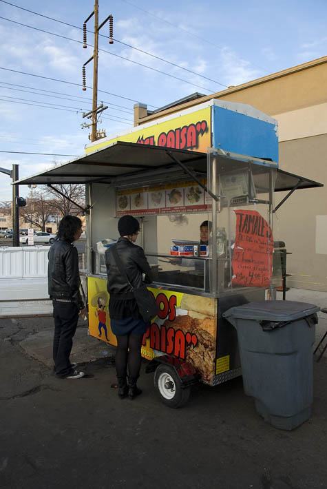 Being a downtown resident without a car limits my daytime mobility (I can mooch off my Sugar Momma at night and use her car), but I find myself stoned and hungry at noon more often than I like to admit. This means that the area around Sears has become like Mecca to me. I am not sure, but I think I counted 637 taco stands in the immediate vicinity. It has taken me a while to decide because they are all great, but one has come to stand out above the rest, Taqueria “El Paisa” on the southeast corner of 800 south and Main. You would think that spending all this time eating Mexican food I would have picked up a little Spanish. Being the shitty American that I am and possibly because of a slew of learning disabilities, I haven’t, so I will refer to all menu items by their English names. In a one week period I stopped by El Paisa at least three times, sometimes dragging a semiwilling friend and my wife along so I could sample their dish as well.