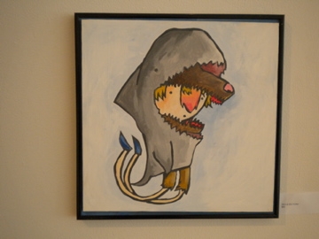 The works continue to be varied. The husband and wife duo, Nick and Erin Potter, recognized for their printmaking techniques, present a simple image: a cartoonish depiction of a boy in a dog suit and, once more, in a whale suit. One can easily envision the piece in a children’s book.
